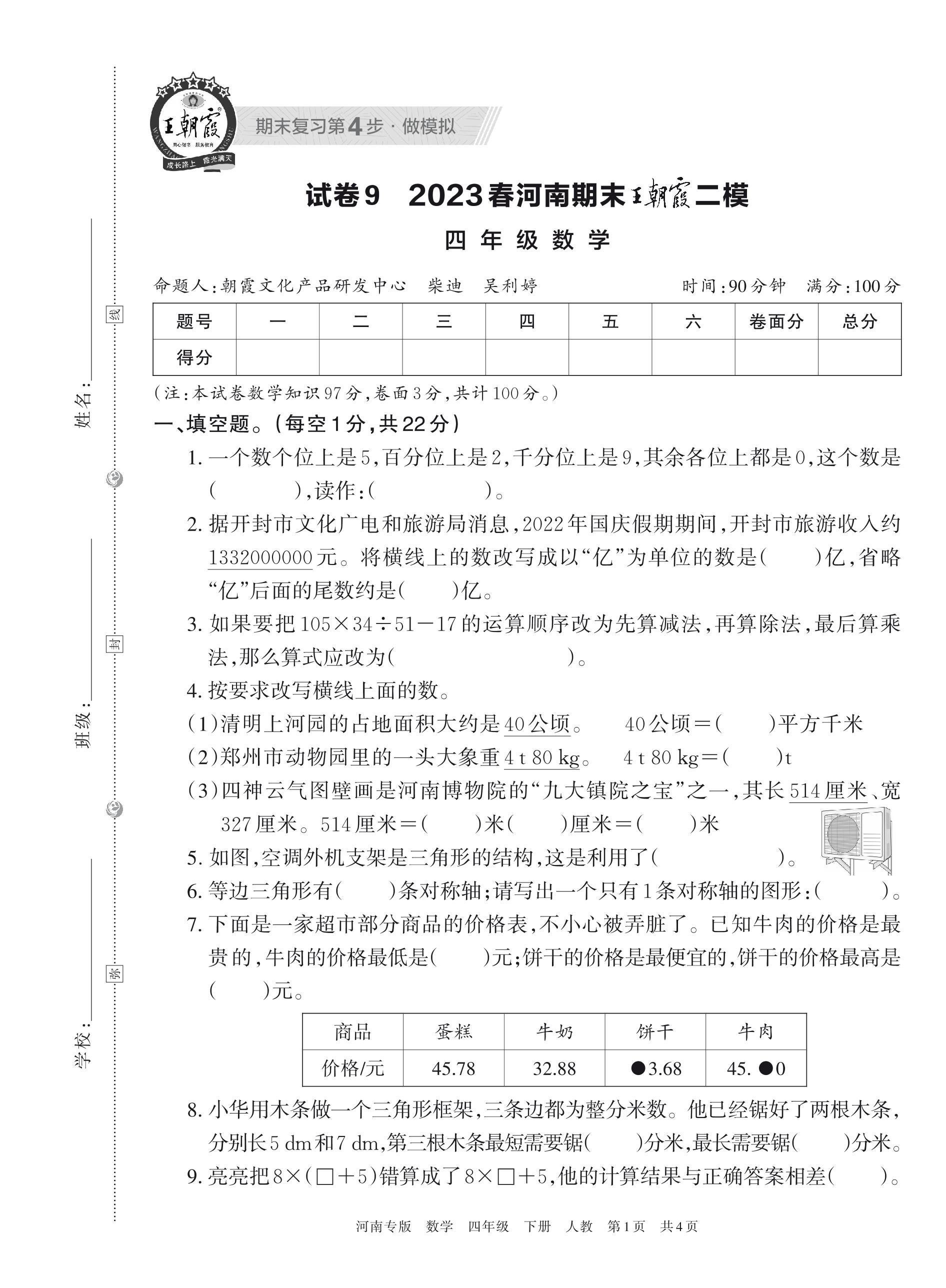 王朝霞期末模拟卷四年级下册数学(人教版)_R230428110050519【9】