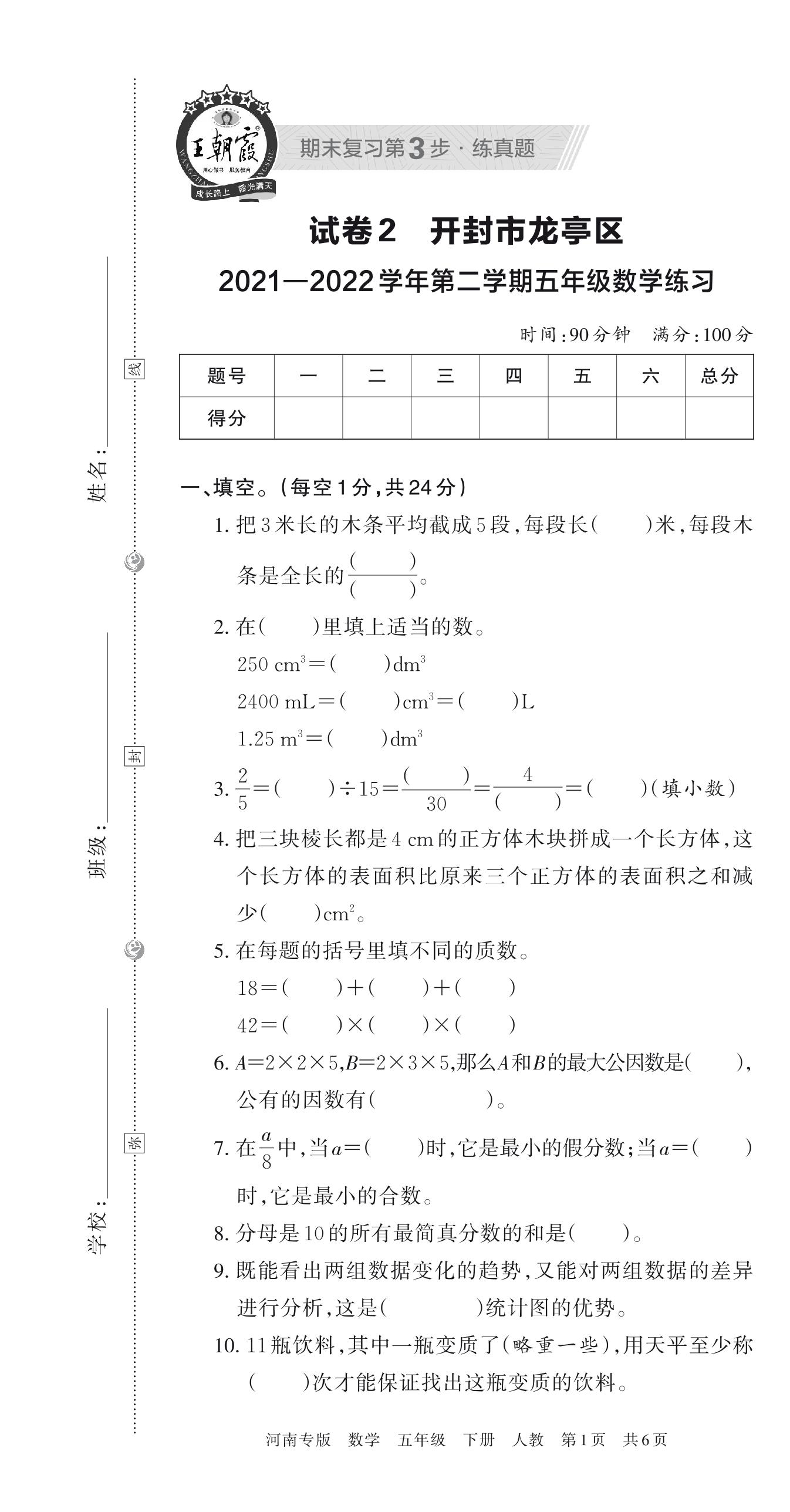 五年级数学人教版下册期末卷