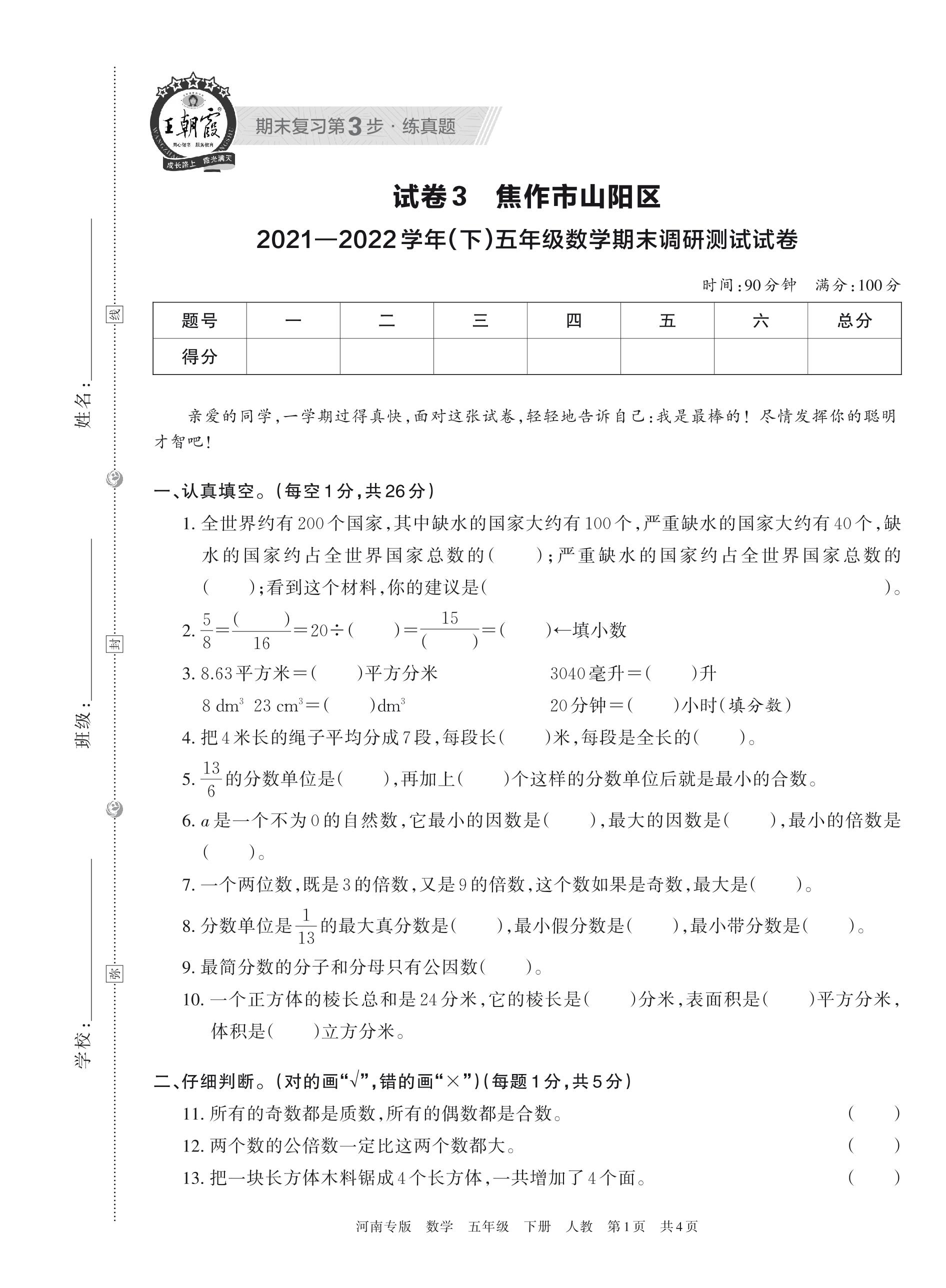焦作市山阳区2021—2022学年(下)五年级数学期末调研测试试卷(人教版)【3】
