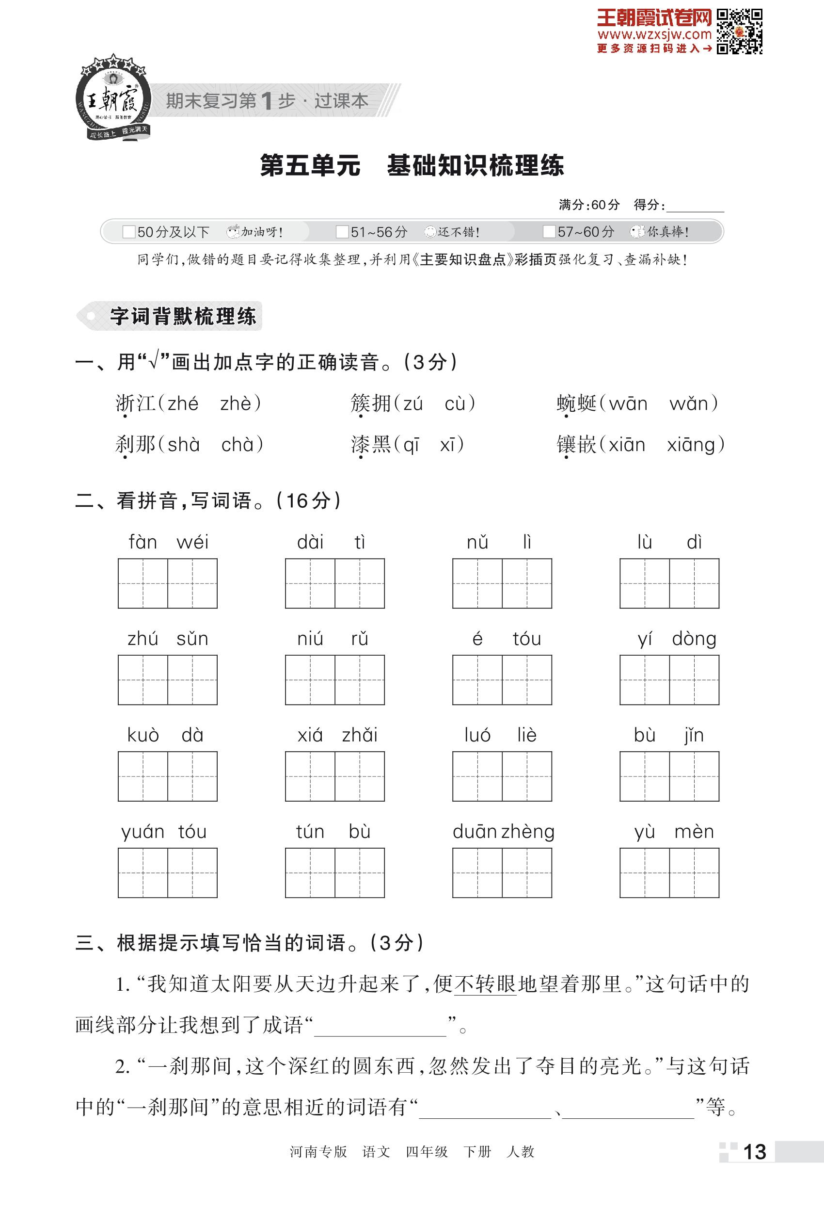 王朝霞期末过课本——第五单元 基础知识梳理练四年级下册语文(人教版)_R230428111227560