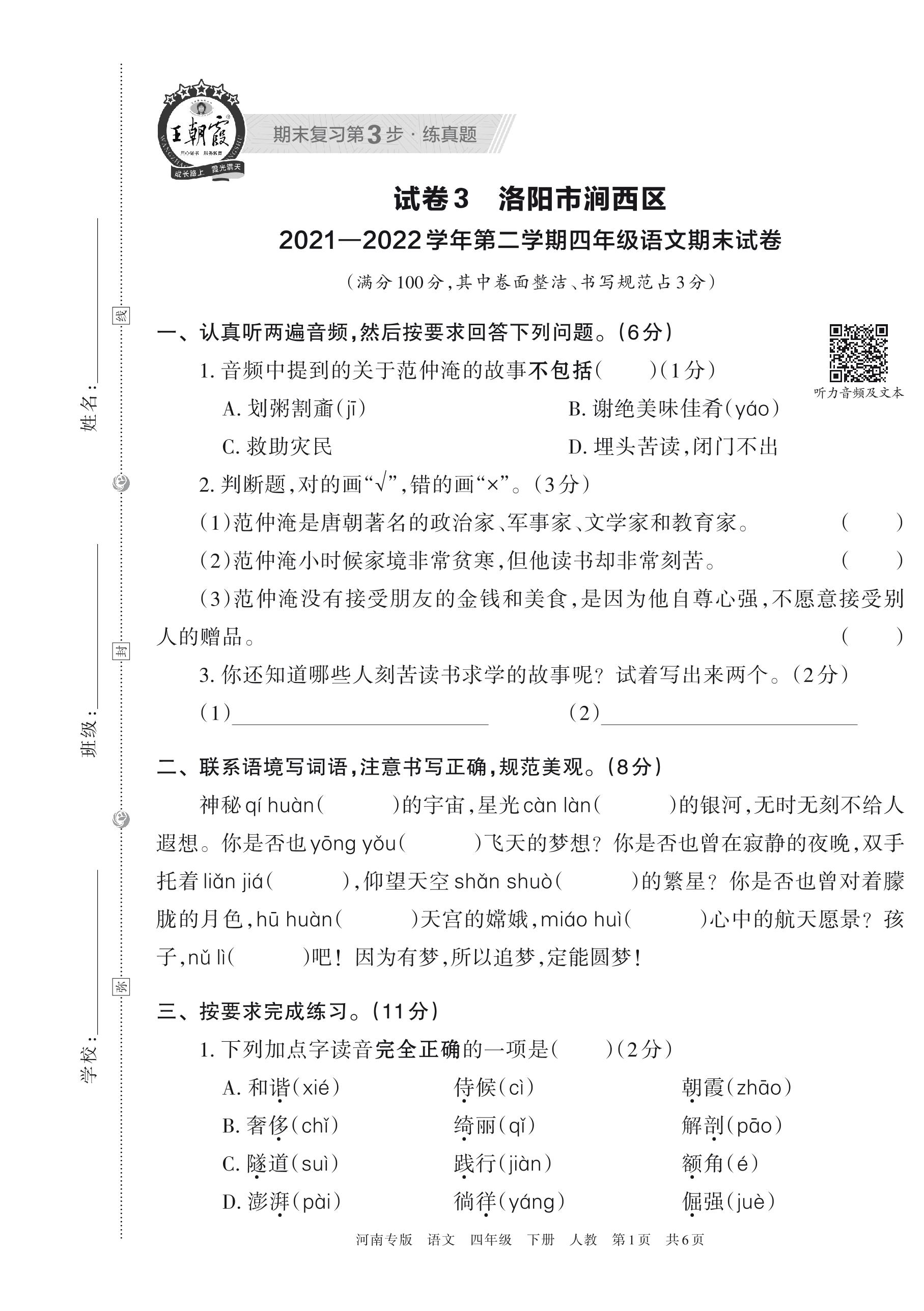 洛阳市涧西区2021—2022学年第二学期四年级语文期末试卷(人教版)【3】