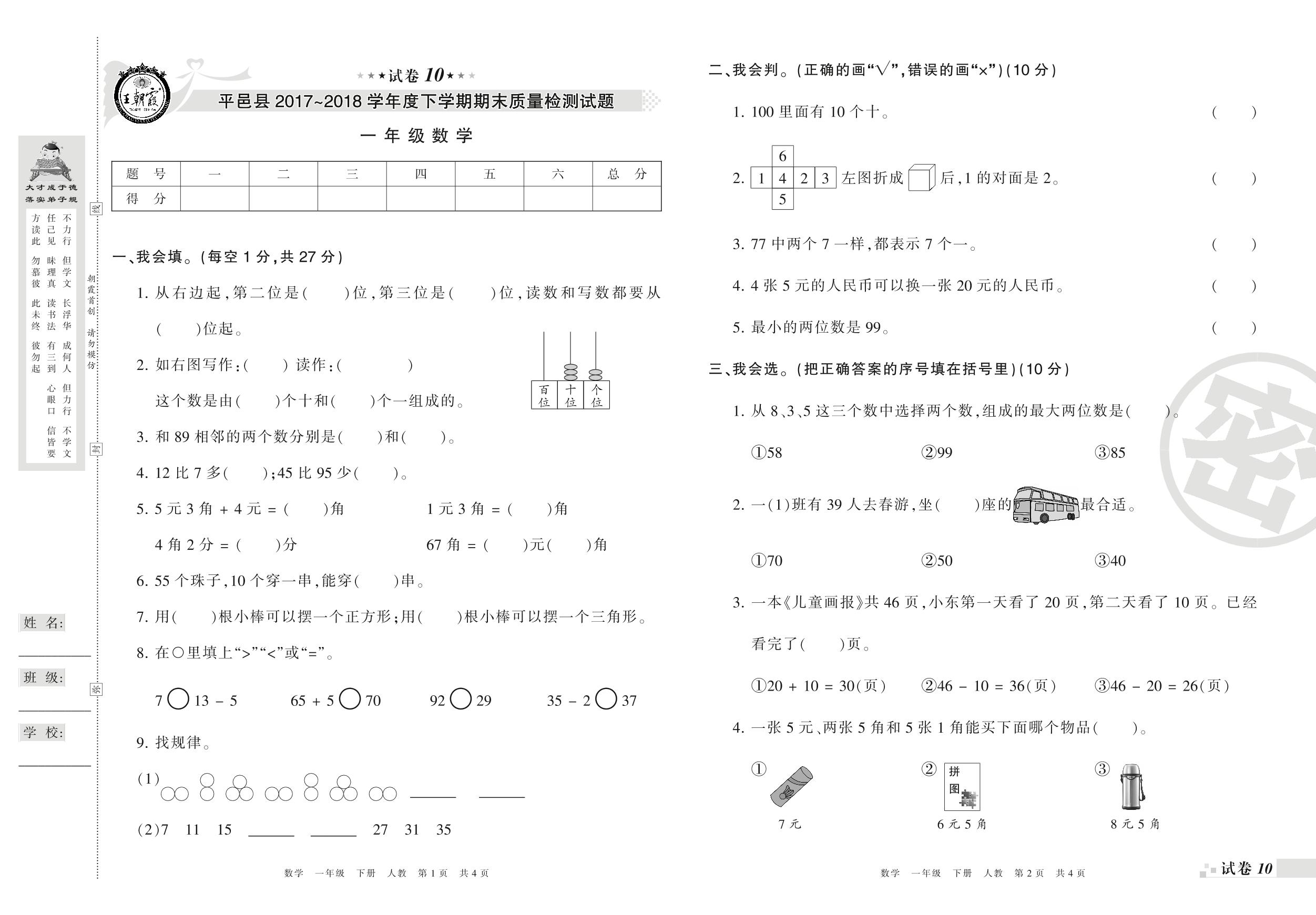 2017-2018学年第二学期临沂市平邑县一年级数学试卷(人教版)【10】