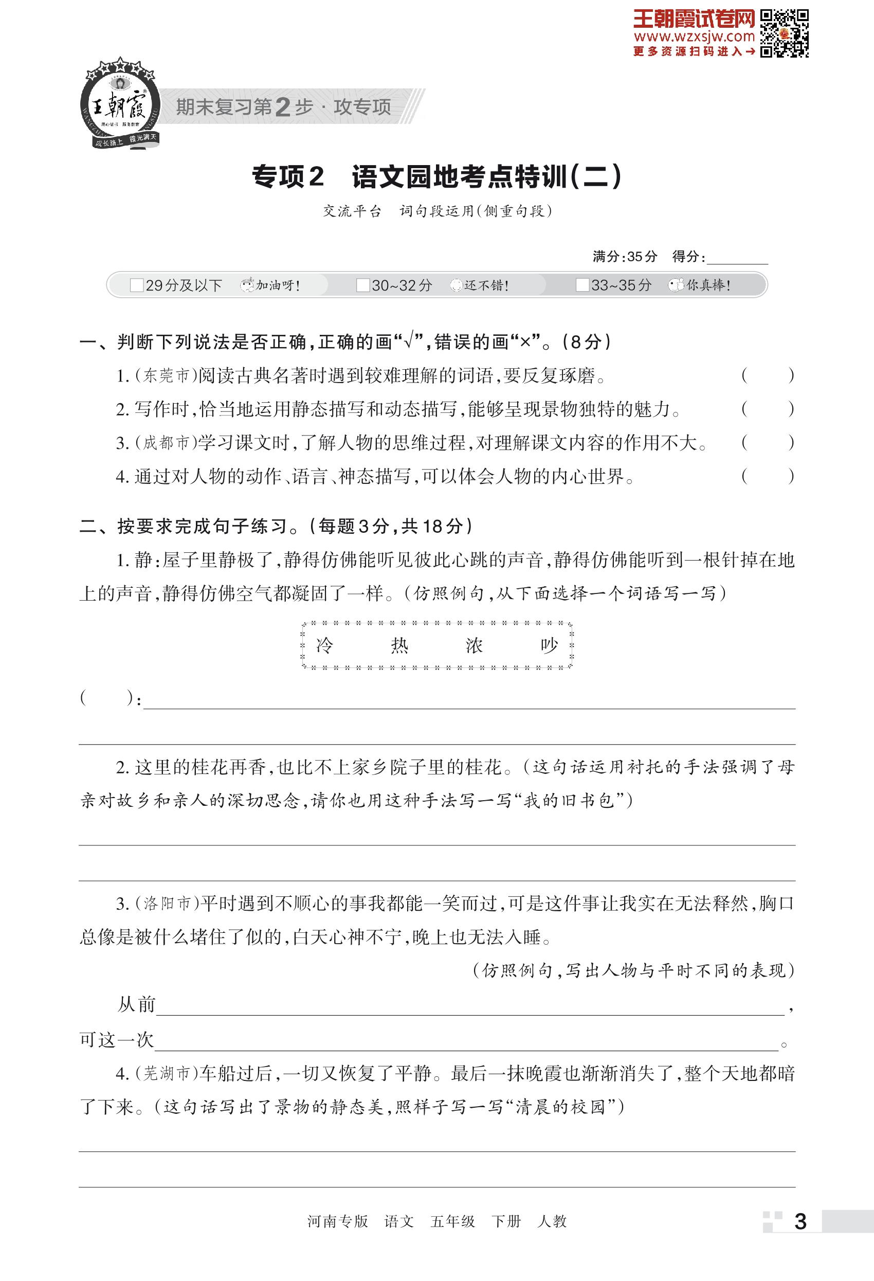 王朝霞期末专项卷——语文园地考点特训(二)五年级下册语文(人教版)_R230428111724050【2】