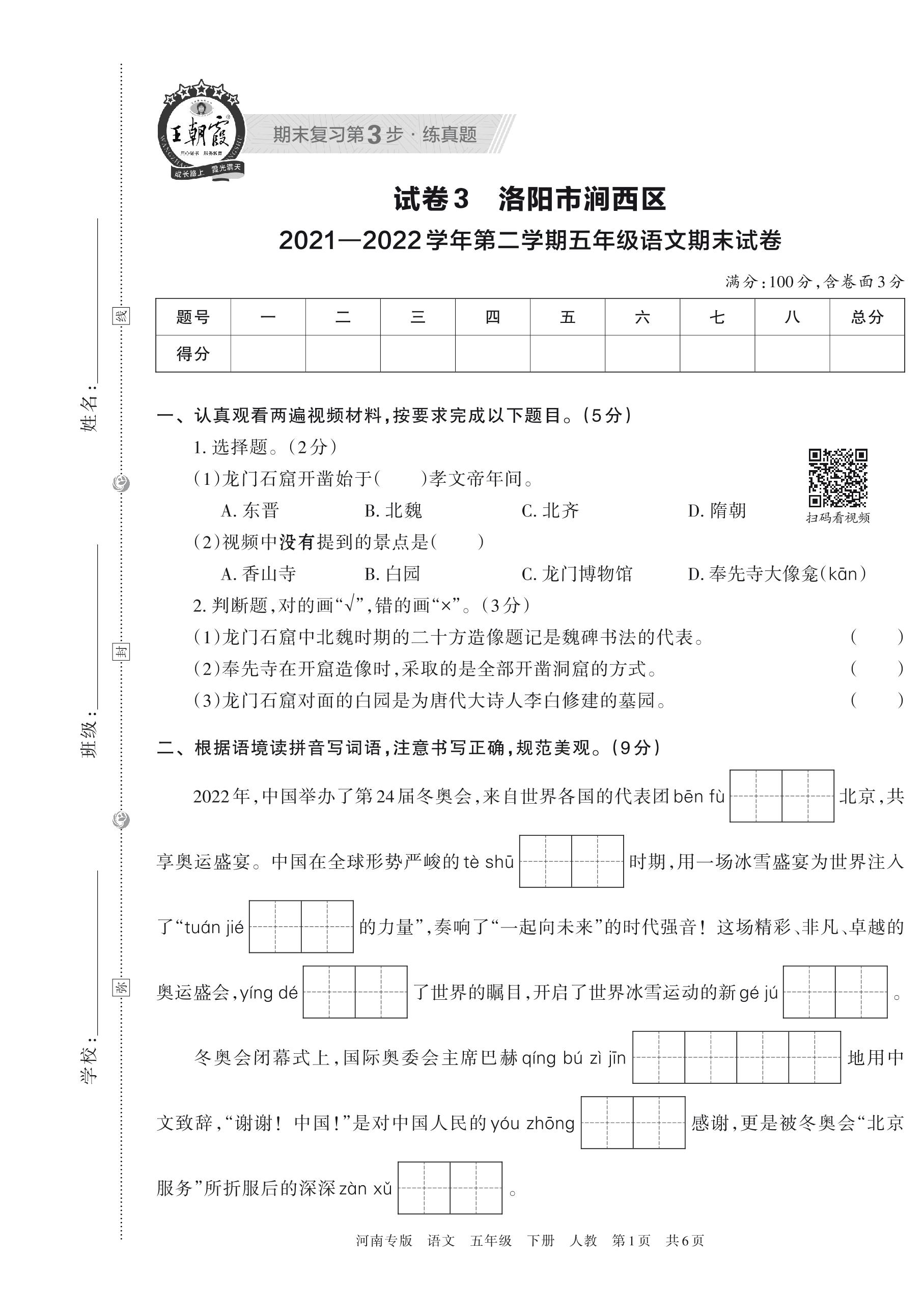 洛阳市涧西区2021—2022学年第二学期五年级语文期末试卷(人教版)【3】