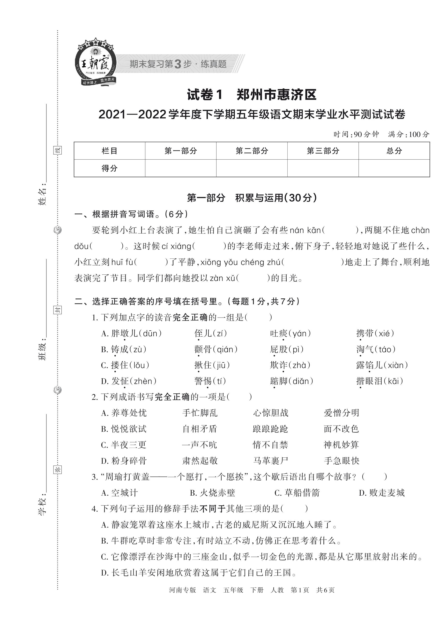 郑州市惠济区2021—2022学年度下学期五年级语文期末学业水平测试试卷(人教版)【1】