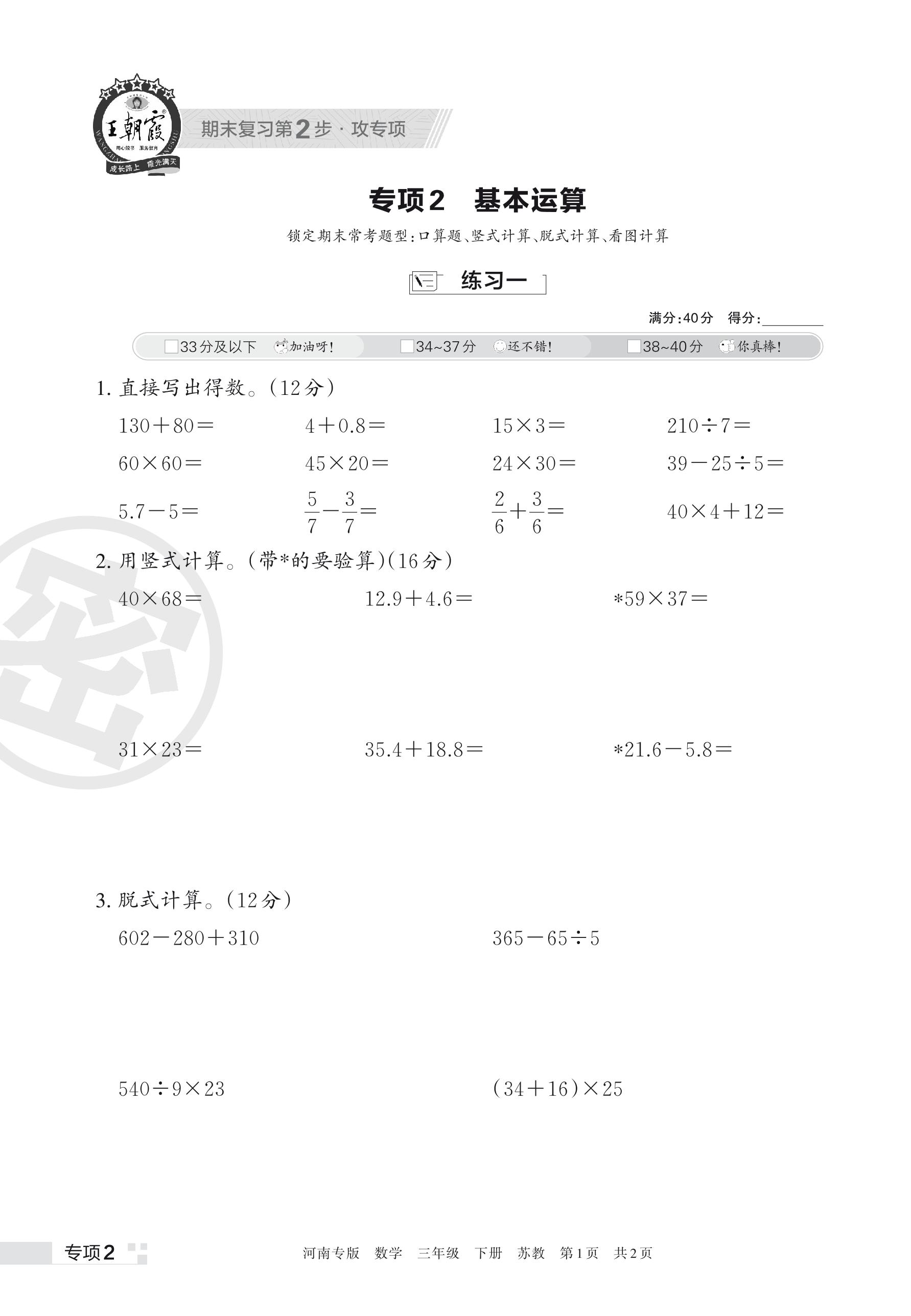 王朝霞期末专项卷——基本运算三年级下册数学(苏教版)_R230428134245445【2】