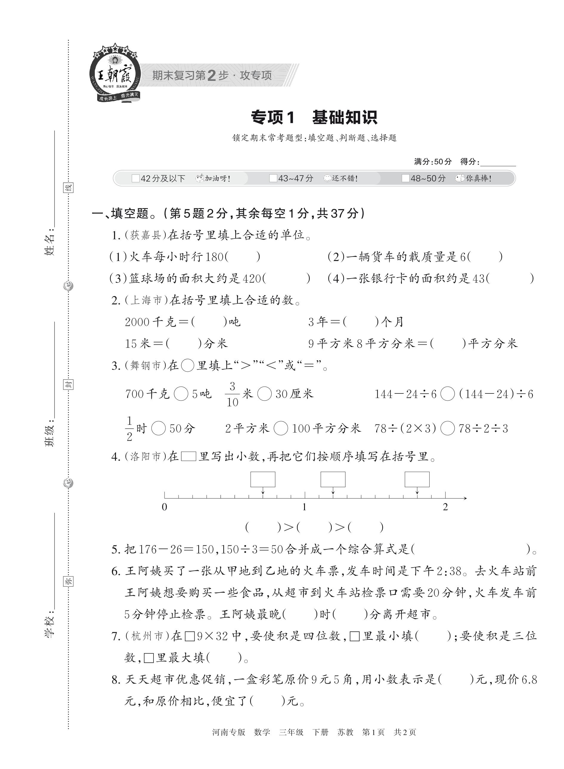 王朝霞期末专项卷——基础知识三年级下册数学(苏教版)_R230428134246631【1】