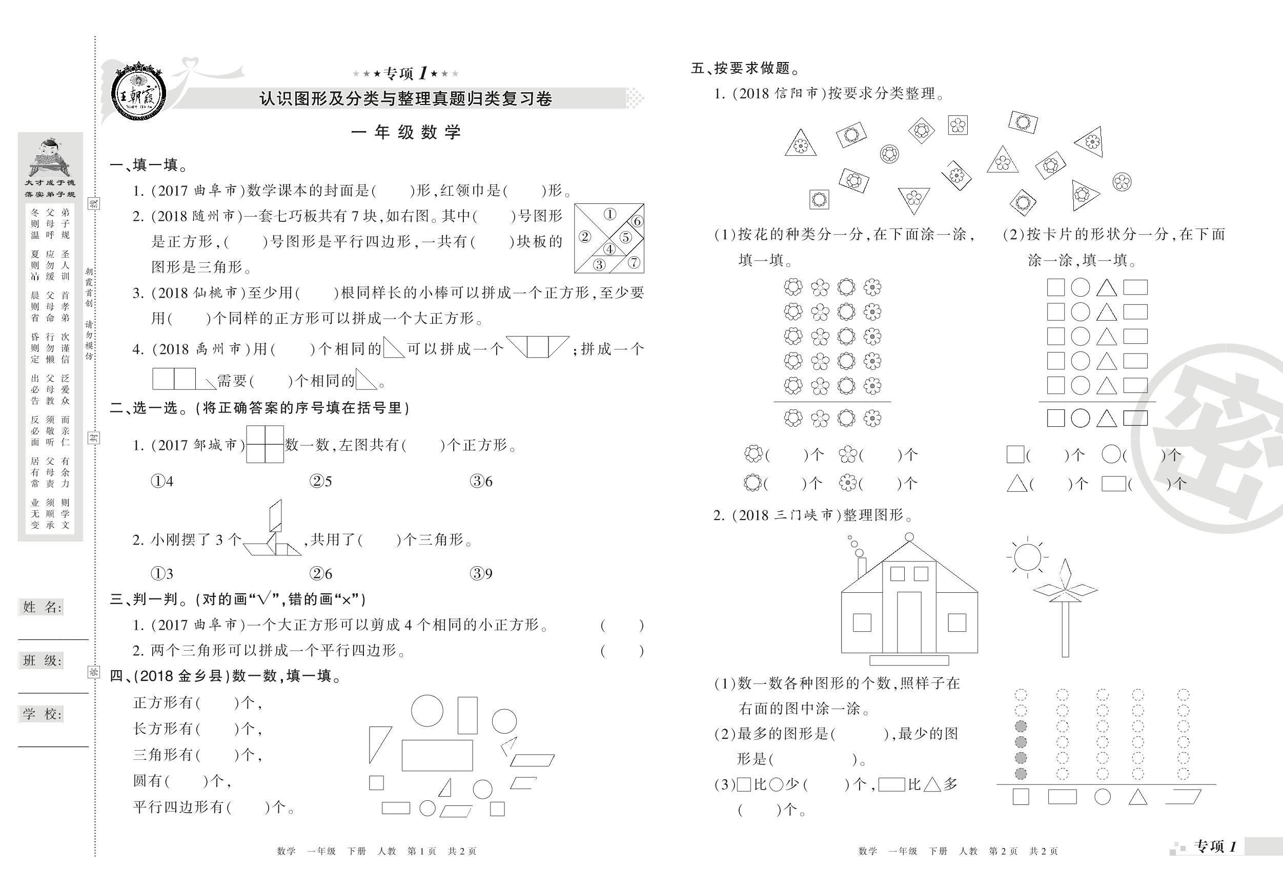 王朝霞期末专项卷——认识图形及分类与整理、20以内的退位减法及找规律真题归类复习卷一年级下册数学(人教版)_R210802221925【0】