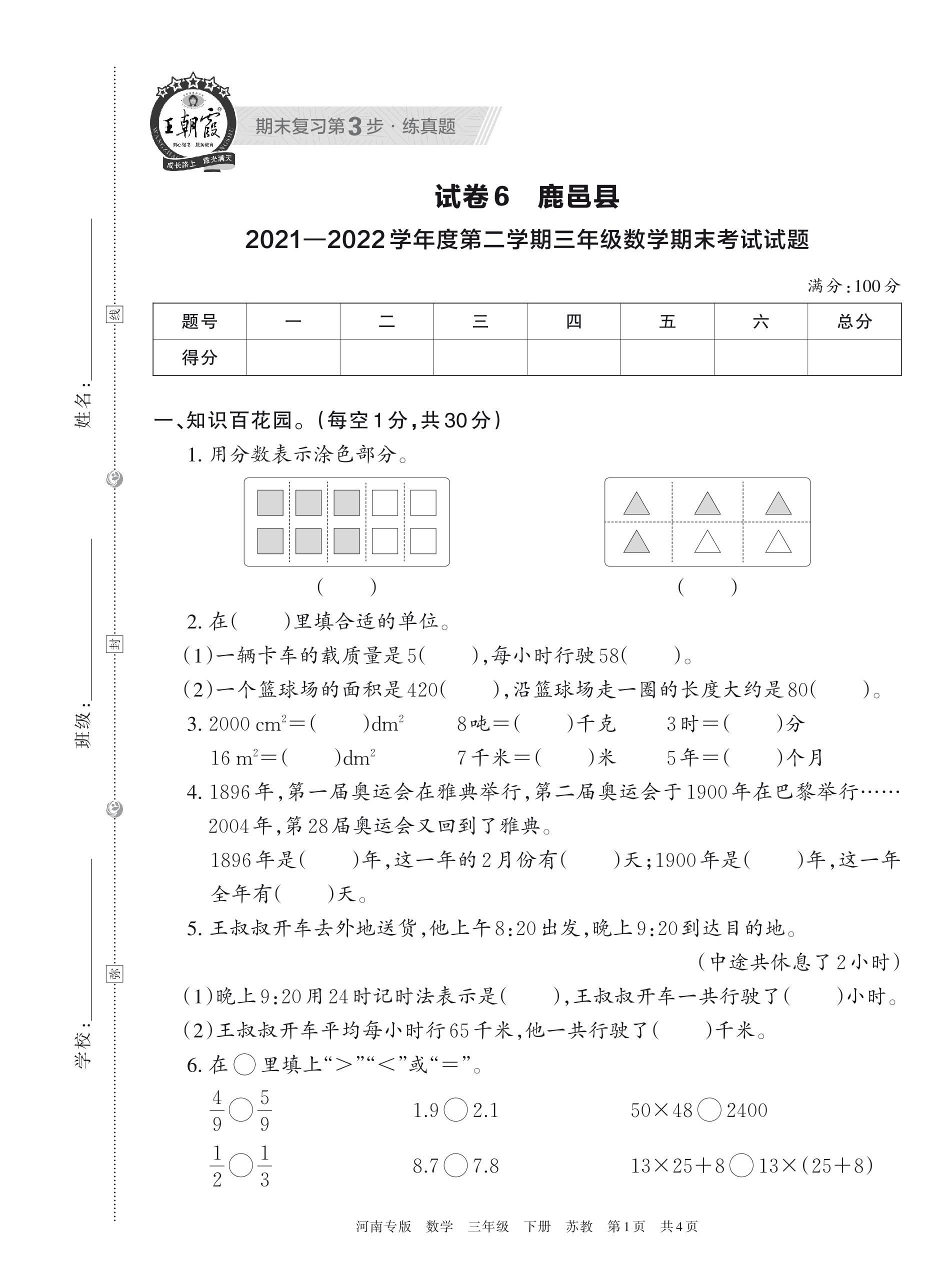 鹿邑县2021—2022学年度第二学期三年级数学期末考试试题(苏教版)【6】