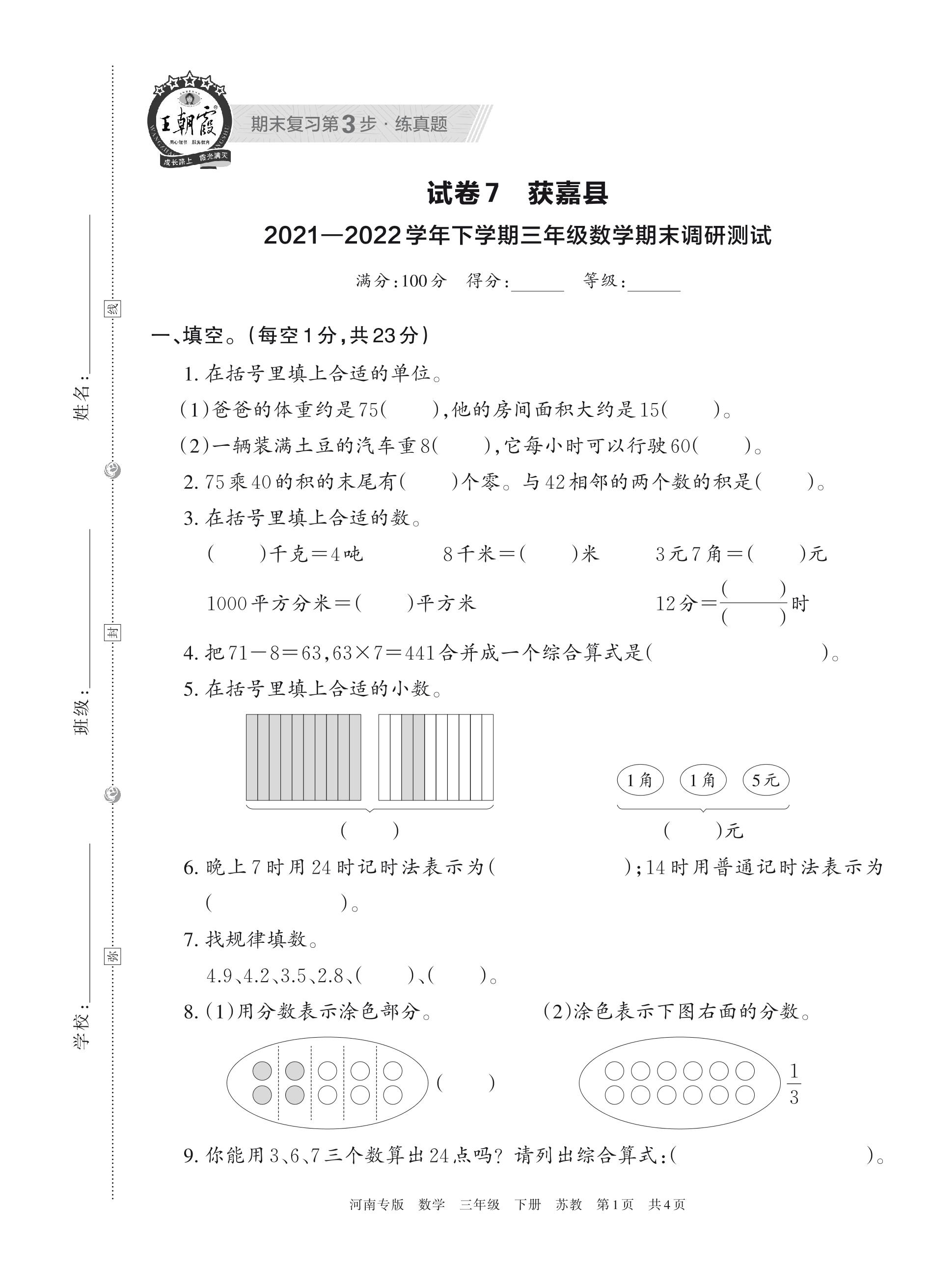 获嘉县2021—2022学年下学期三年级数学期末调研测试(苏教版)【7】