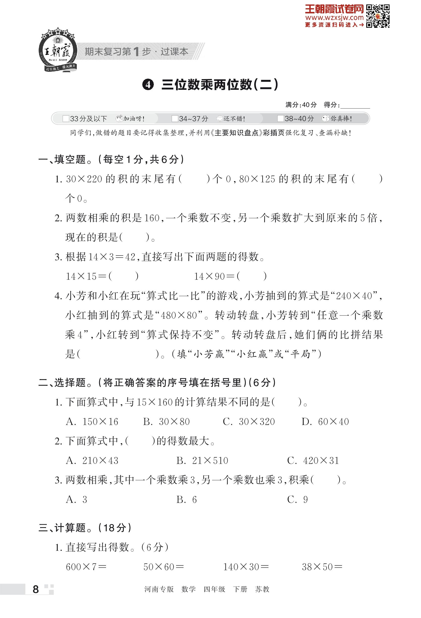 王朝霞期末过课本——4 三位数乘两位数(二)四年级下册数学(苏教版)_R230428134914896