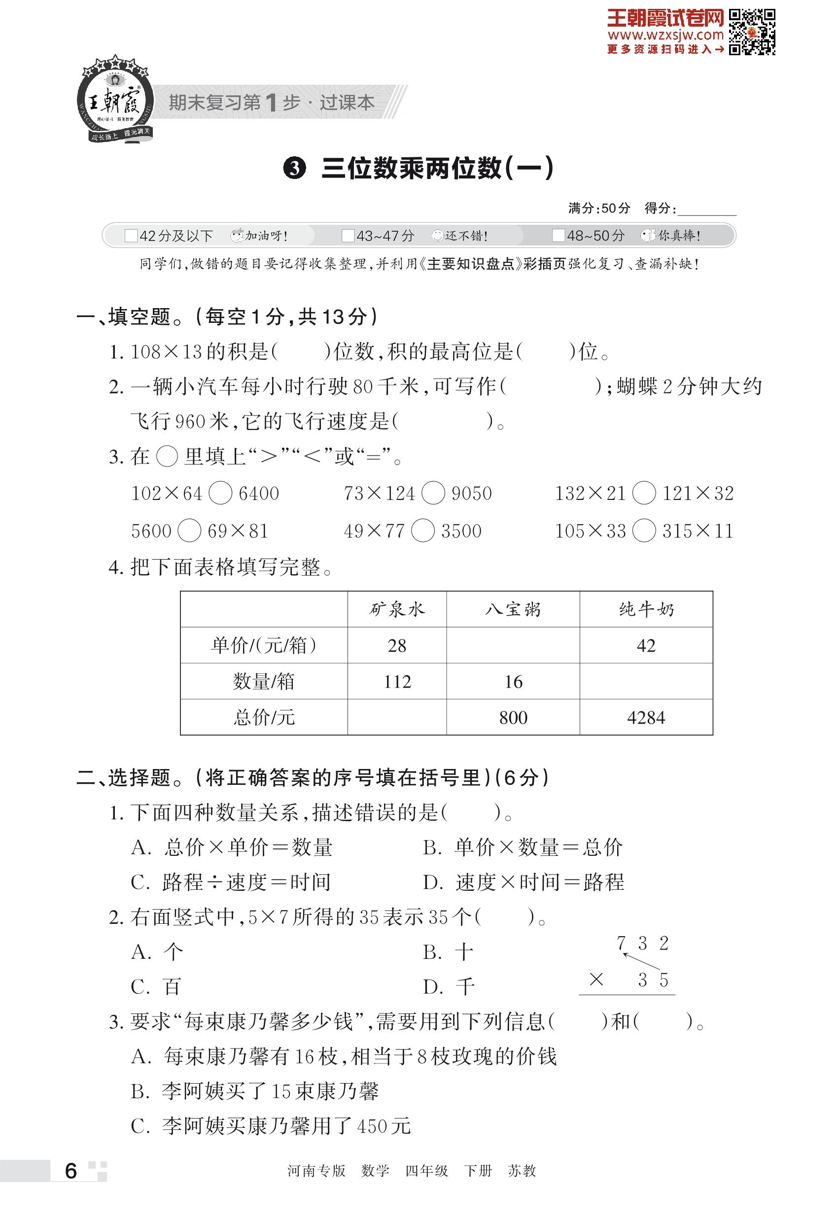 王朝霞期末过课本——3 三位数乘两位数(一)四年级下册数学(苏教版)_R230428134914283