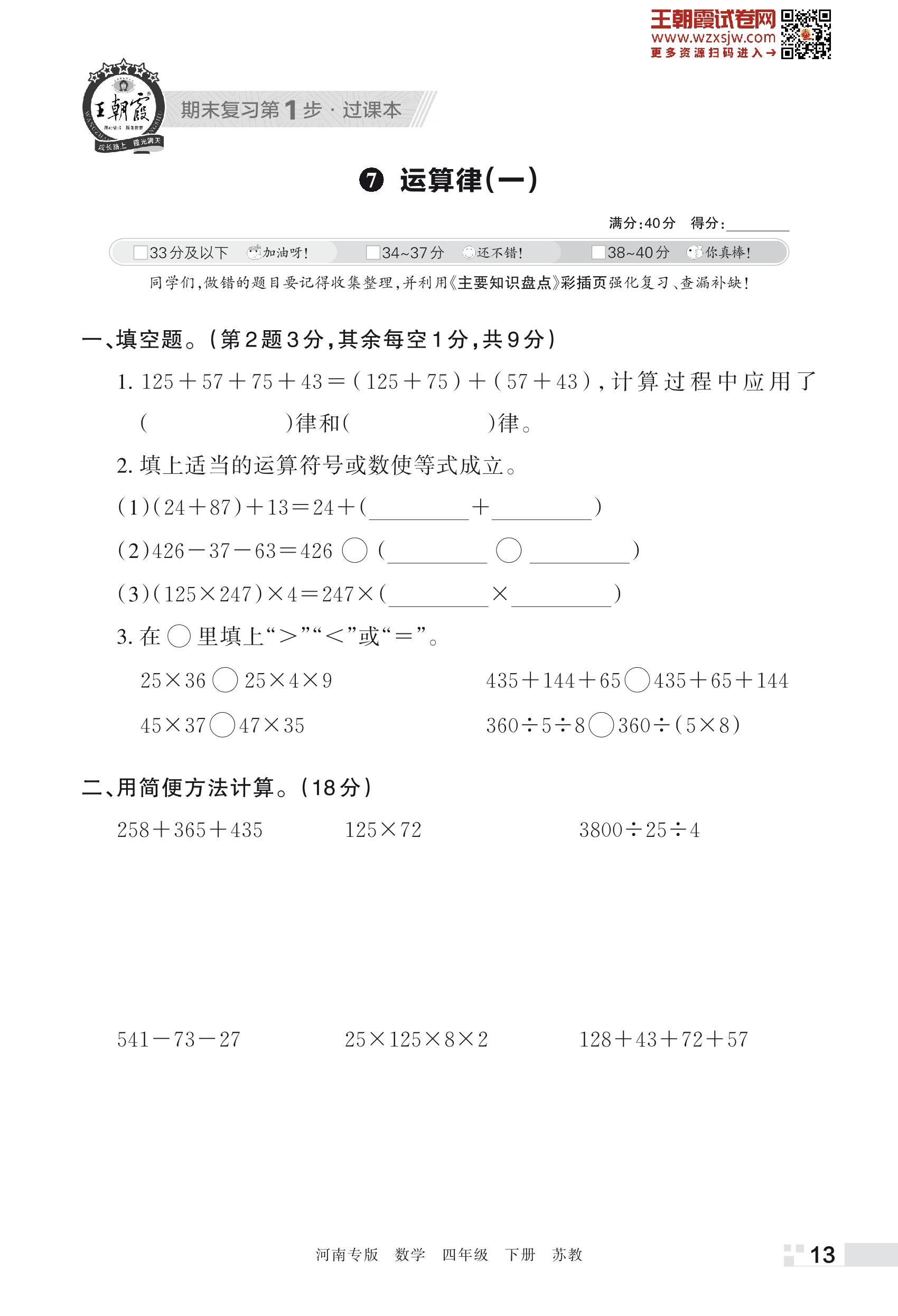 王朝霞期末过课本——7 运算律(一)四年级下册数学(苏教版)_R230428134914021