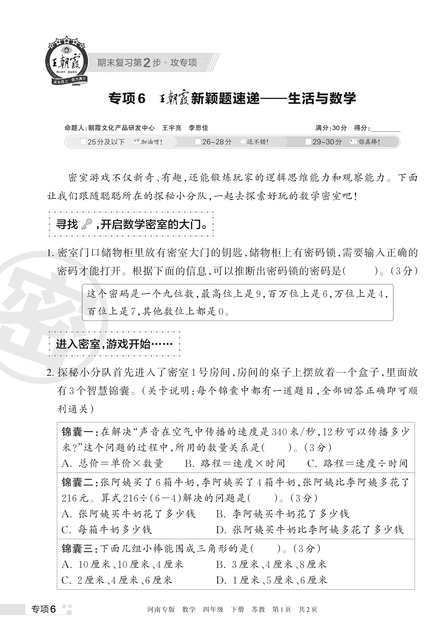 王朝霞期末专项卷——新颖题速递:生活与数学四年级下册数学(苏教版)_R230428134915931【6】