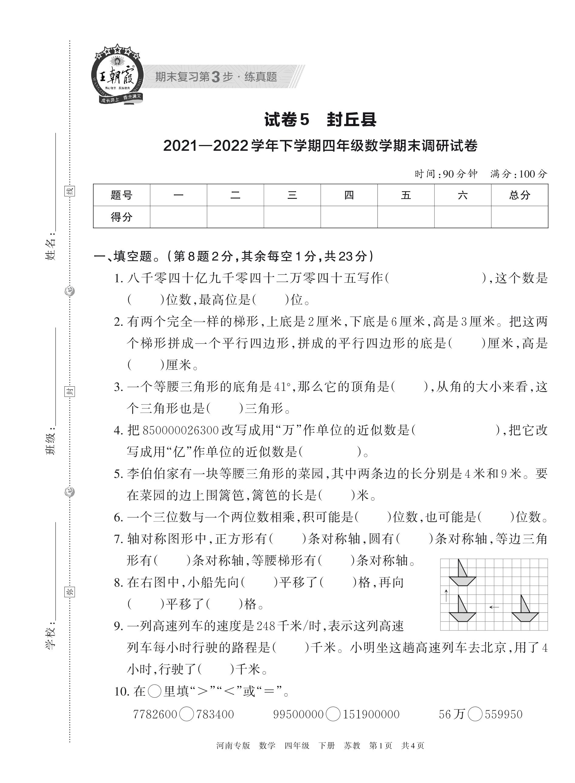 封丘县2021—2022学年下学期四年级数学期末调研试卷(苏教版)【5】