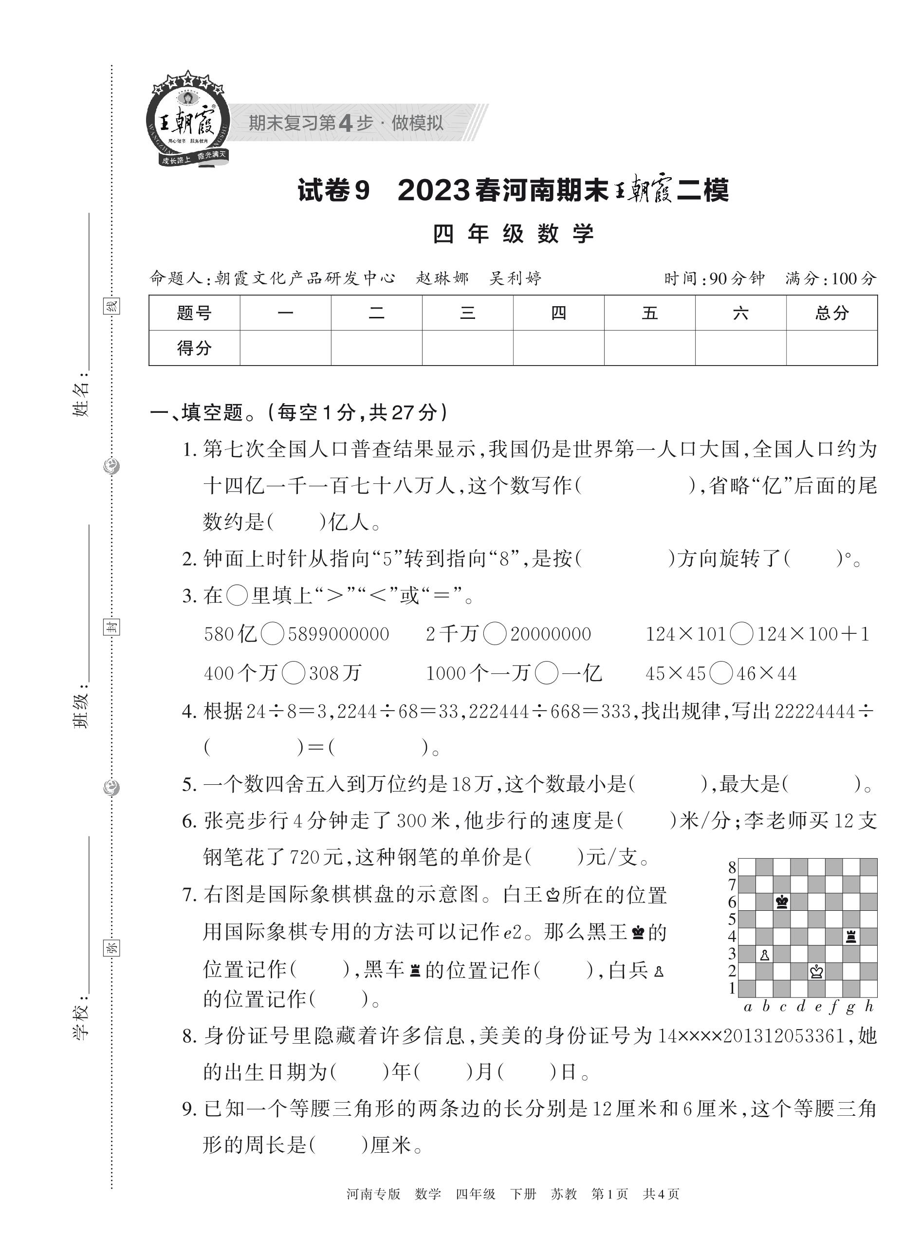 王朝霞期末模拟卷四年级下册数学(苏教版)_R230428134916093【9】