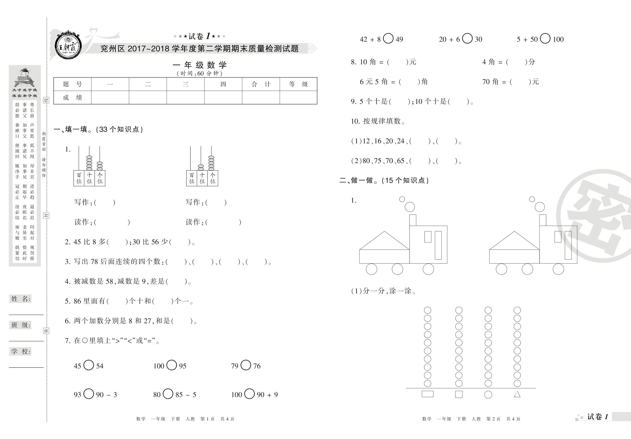 2017-2018学年第二学期济宁市兖州区一年级数学试卷(人教版)【1】