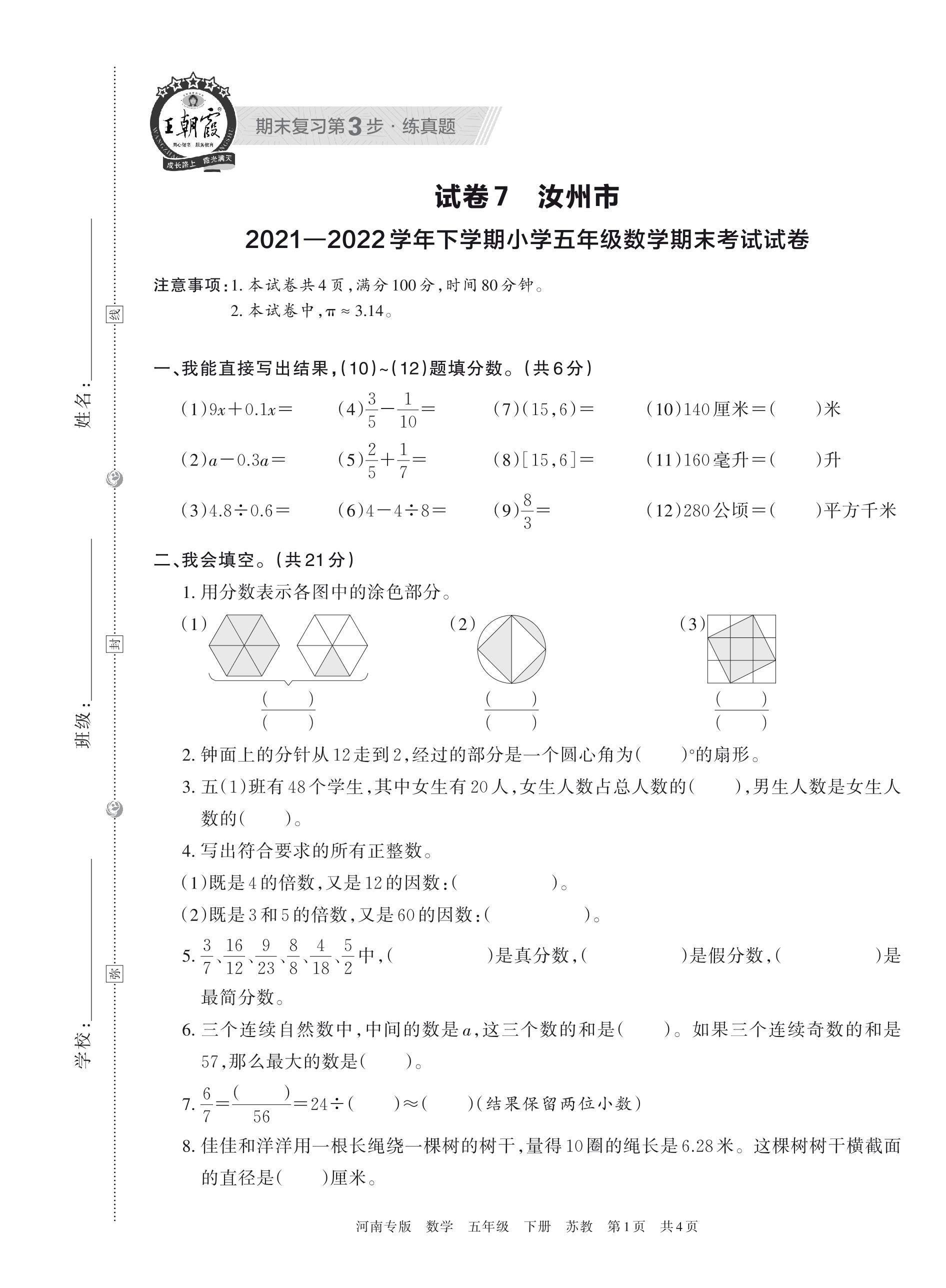 汝州市2021—2022学年下学期小学五年级数学期末考试试卷(苏教版)【7】