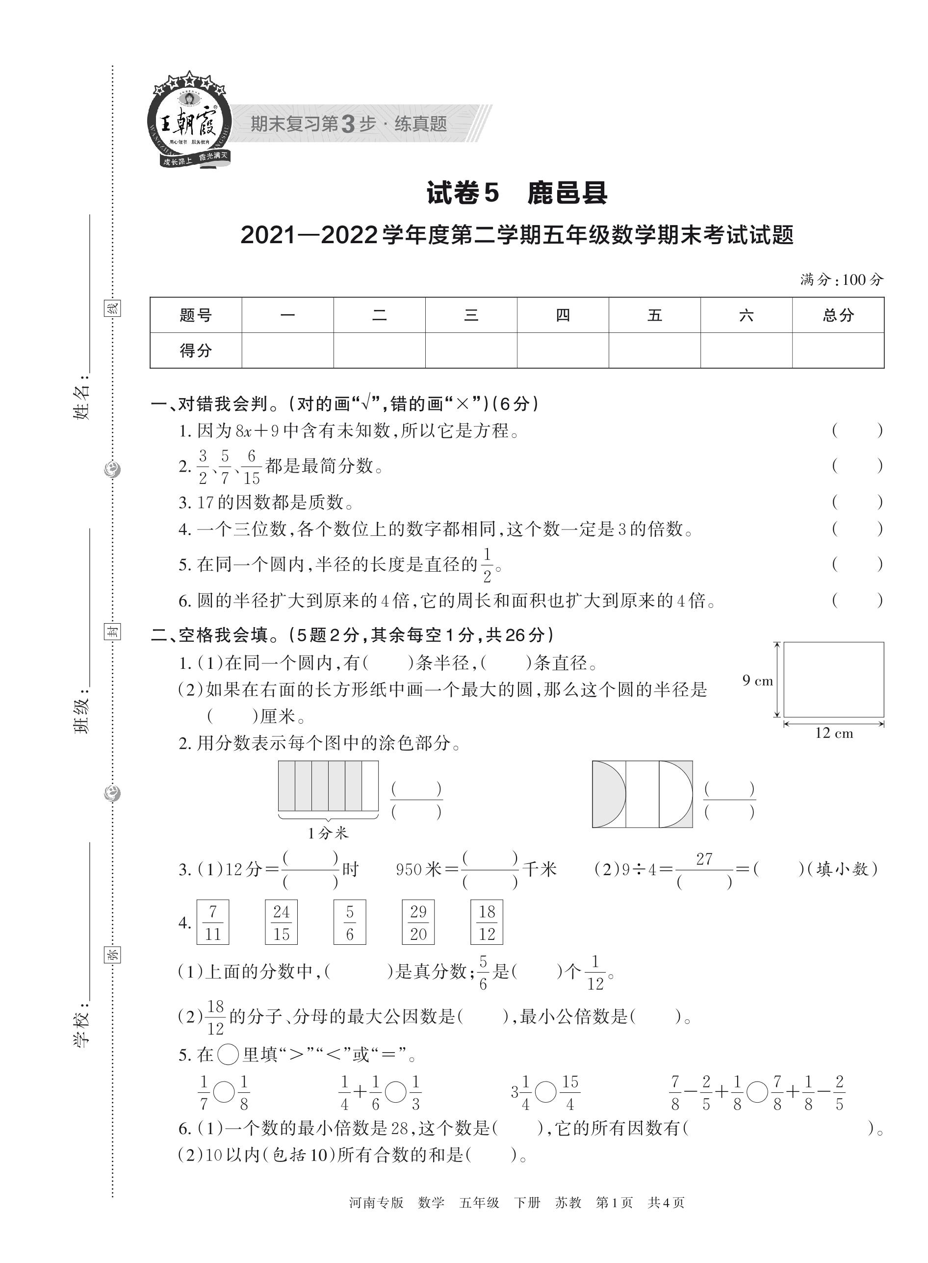 鹿邑县2021—2022学年度第二学期五年级数学期末考试试题(苏教版)【5】