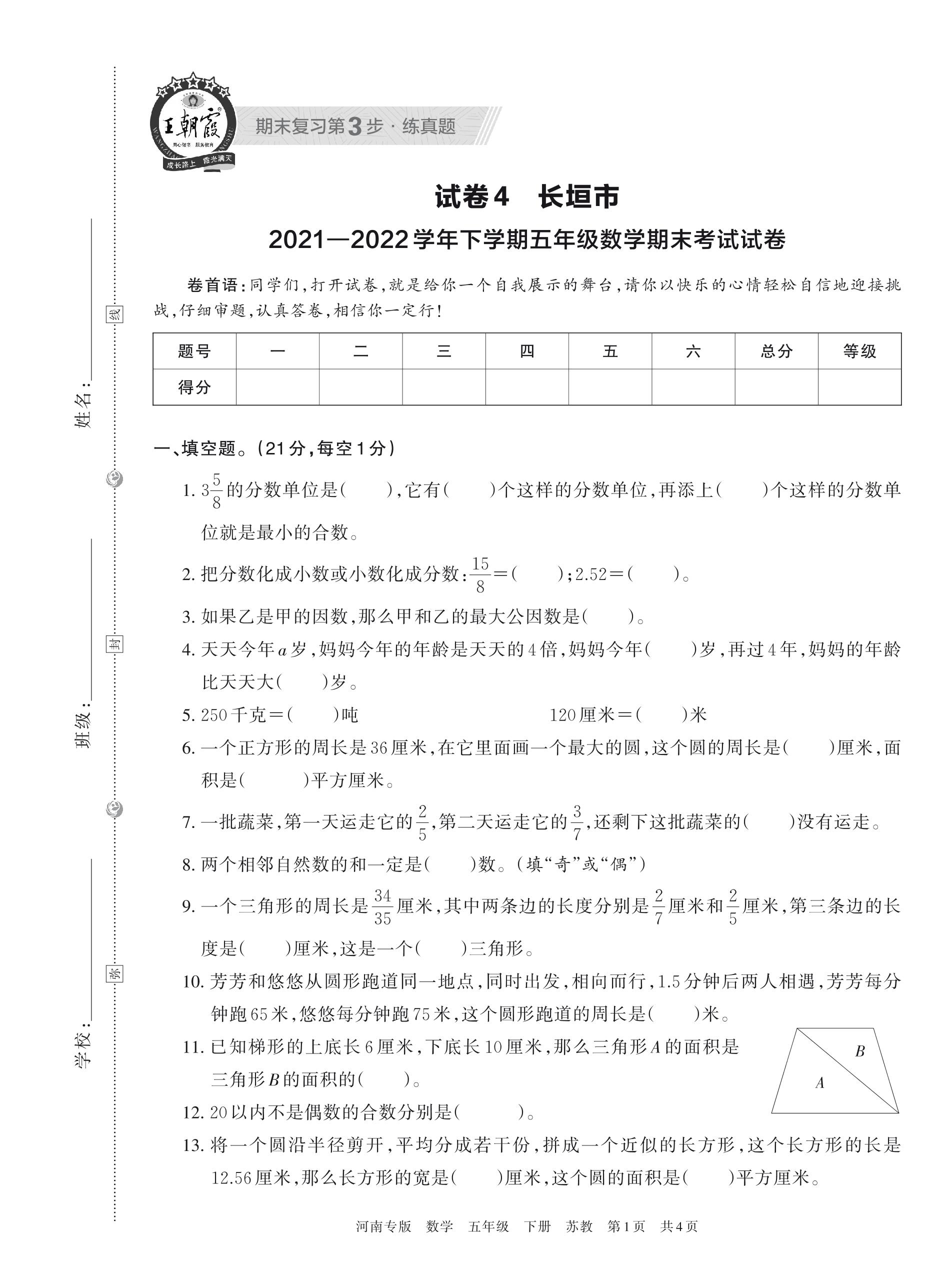 长垣市2021—2022学年下学期五年级数学期末考试试卷(苏教版)【4】