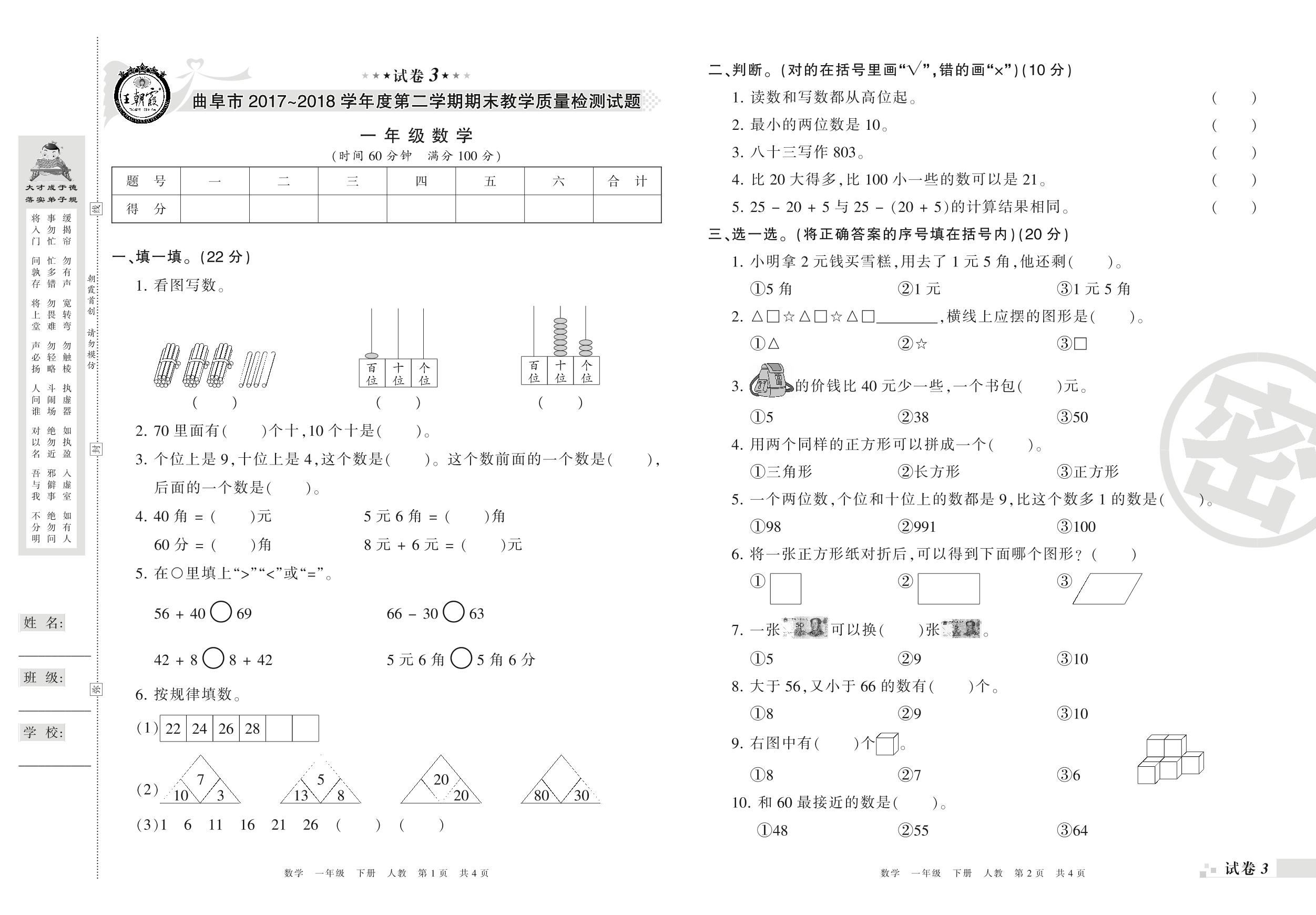 2017-2018学年第二学期曲阜市一年级数学试卷(人教版)【3】