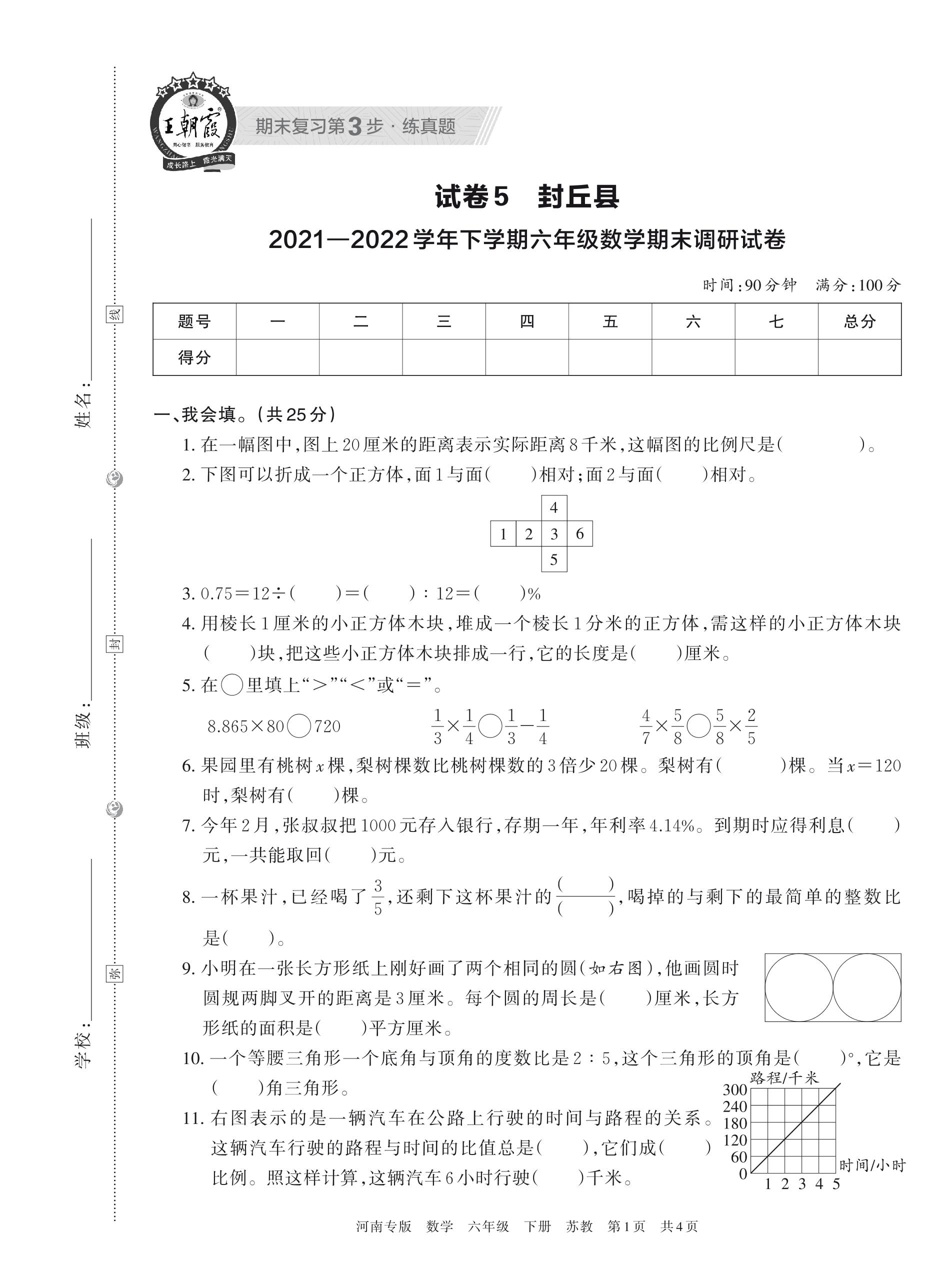 封丘县2021—2022学年下学期六年级数学期末调研试卷(苏教版)【5】