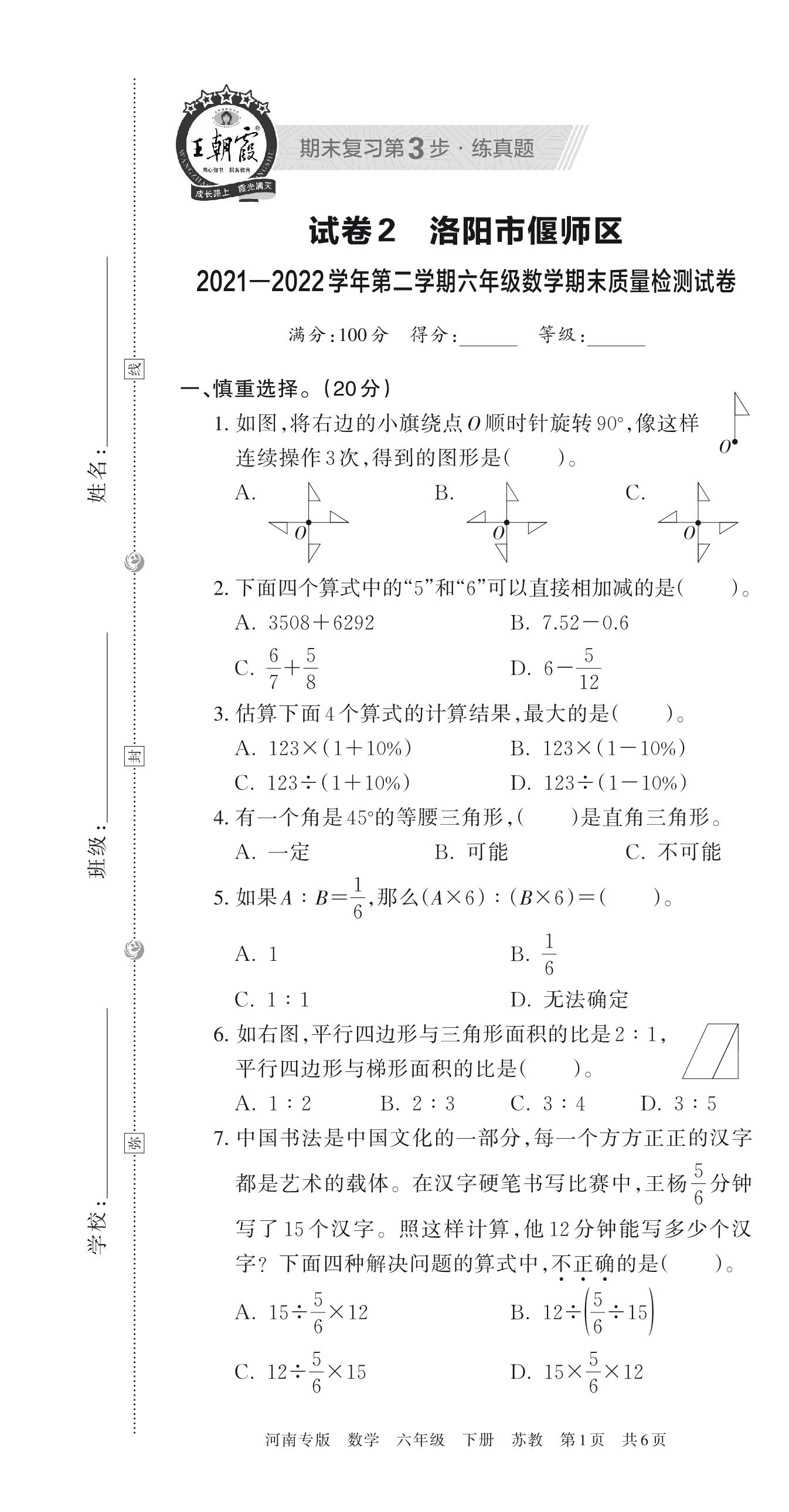洛阳市偃师区2021—2022学年第二学期六年级数学期末质量检测试卷(苏教版)【2】
