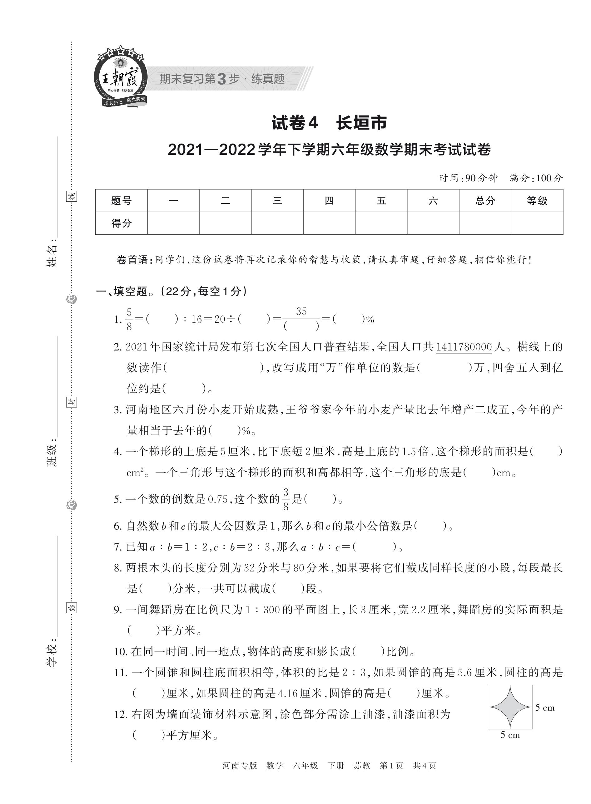 长垣市2021—2022学年下学期六年级数学期末考试试卷(苏教版)【4】