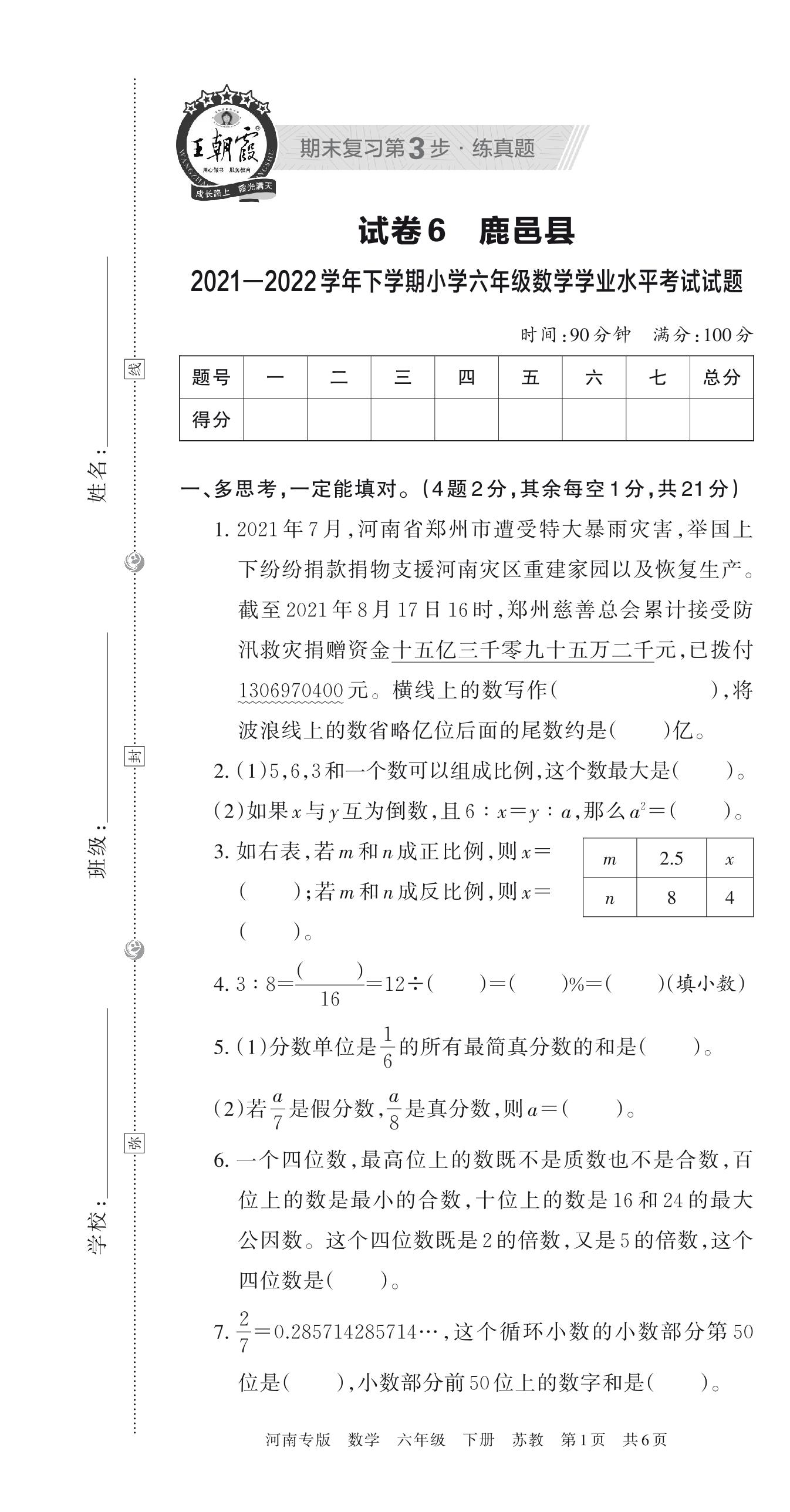 鹿邑县2021—2022学年下学期小学六年级数学学业水平考试试题(苏教版)【6】
