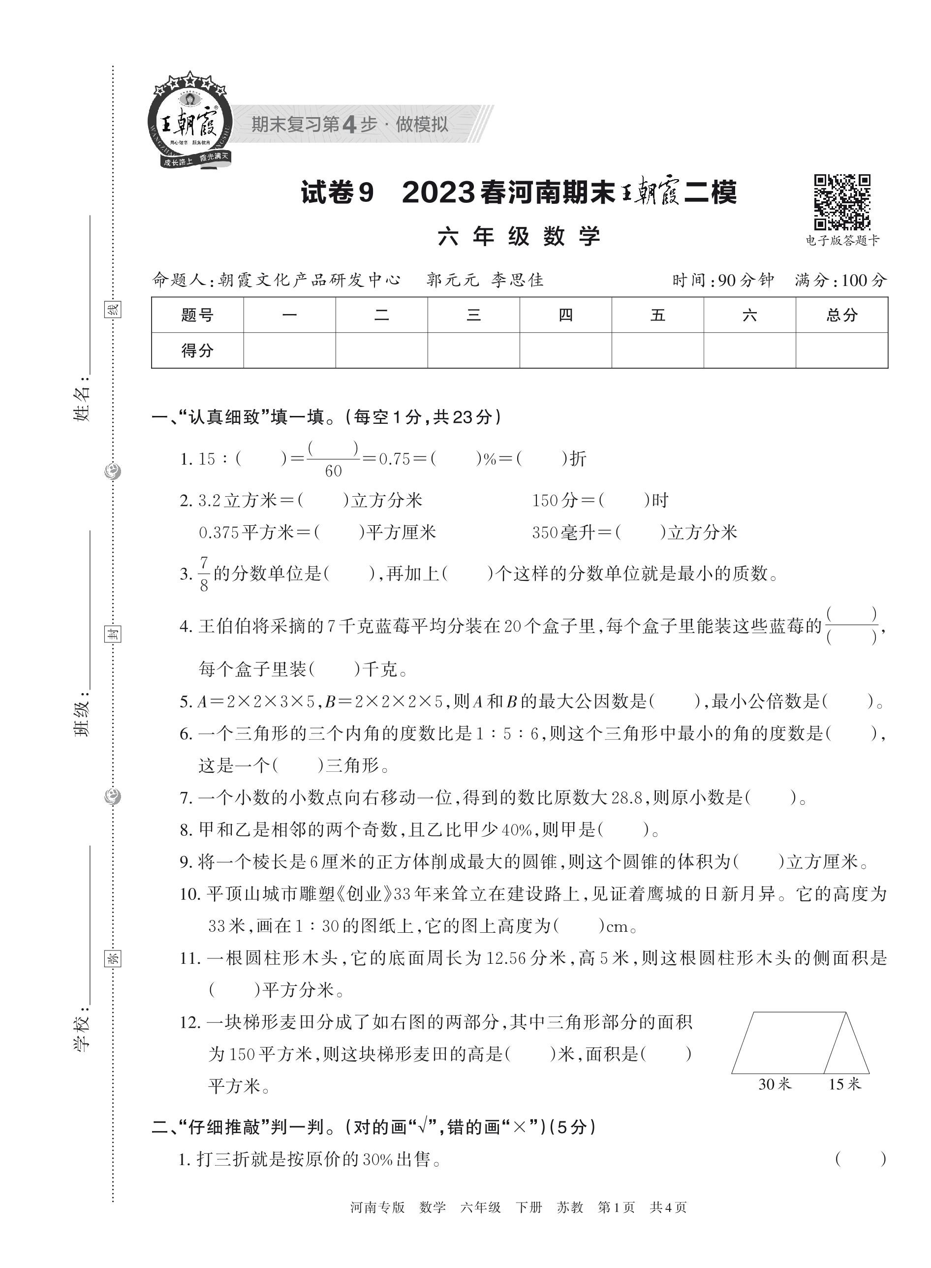 王朝霞期末模拟卷六年级下册数学(苏教版)_R230428140710881【9】