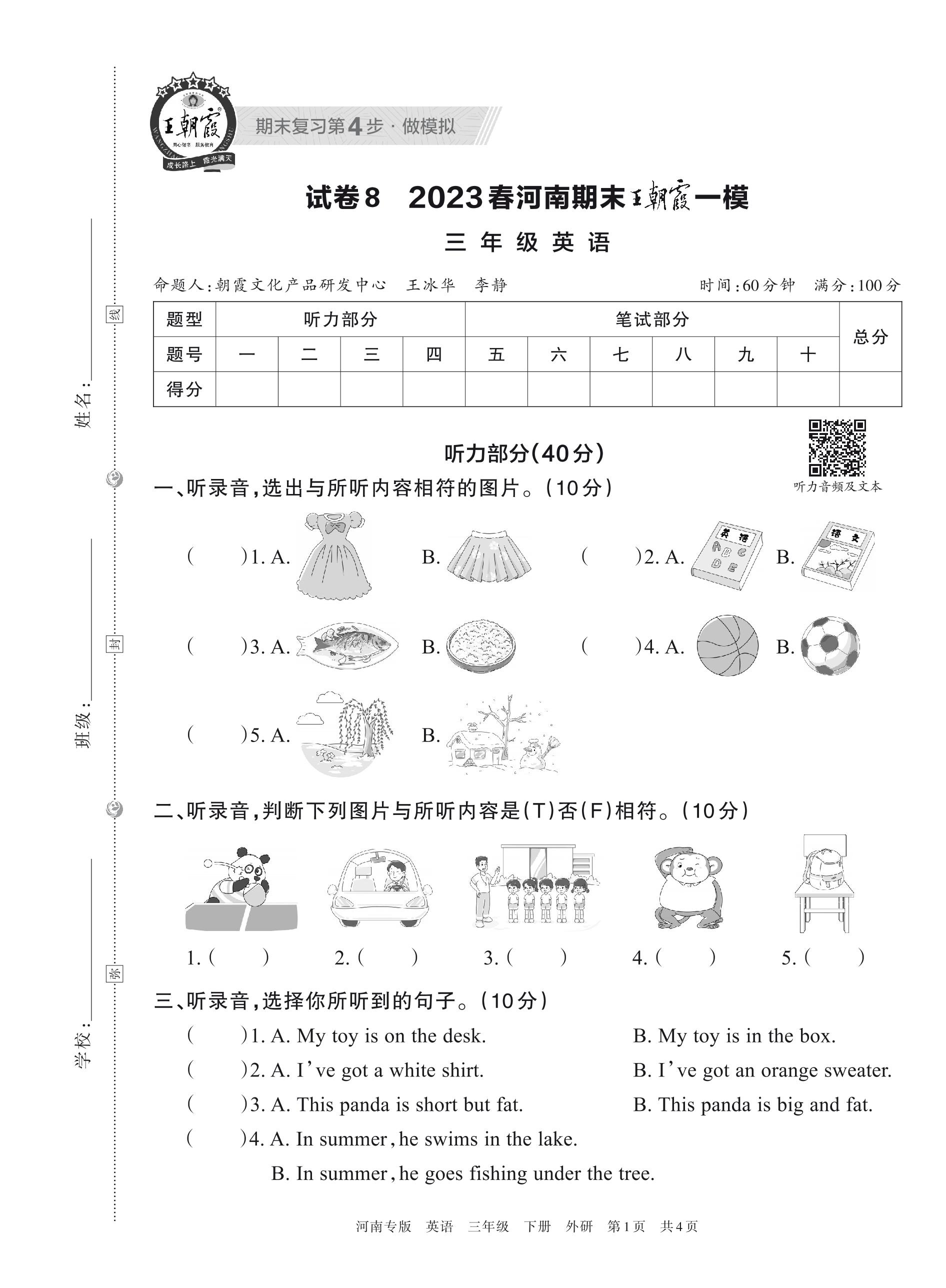 王朝霞期末模拟卷三年级下册英语(外研版)【8】