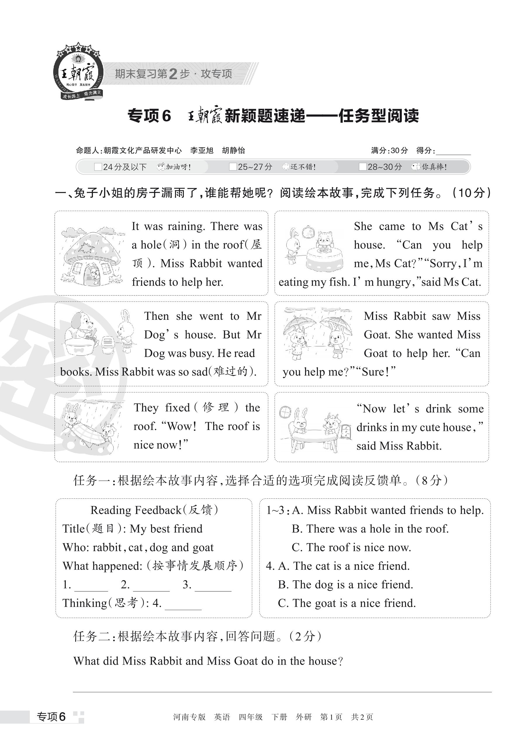 王朝霞期末专项卷——新颖题速递:任务型阅读四年级下册英语(外研版)_R230428141926362【6】