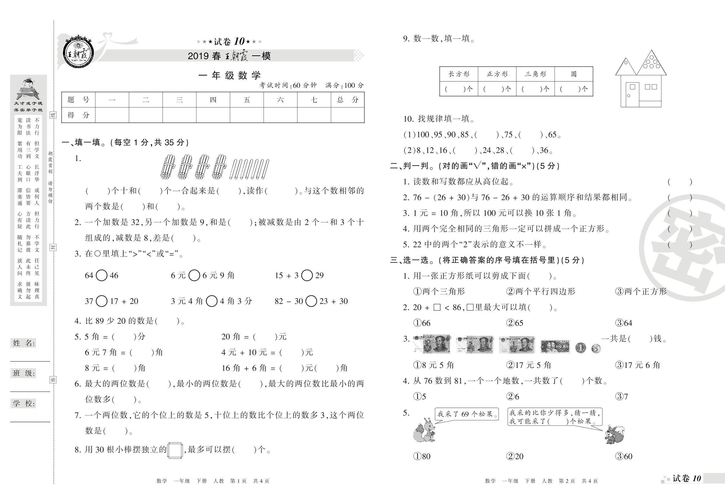 王朝霞期末模拟卷一年级下册数学(人教版)_R210802221946【10】