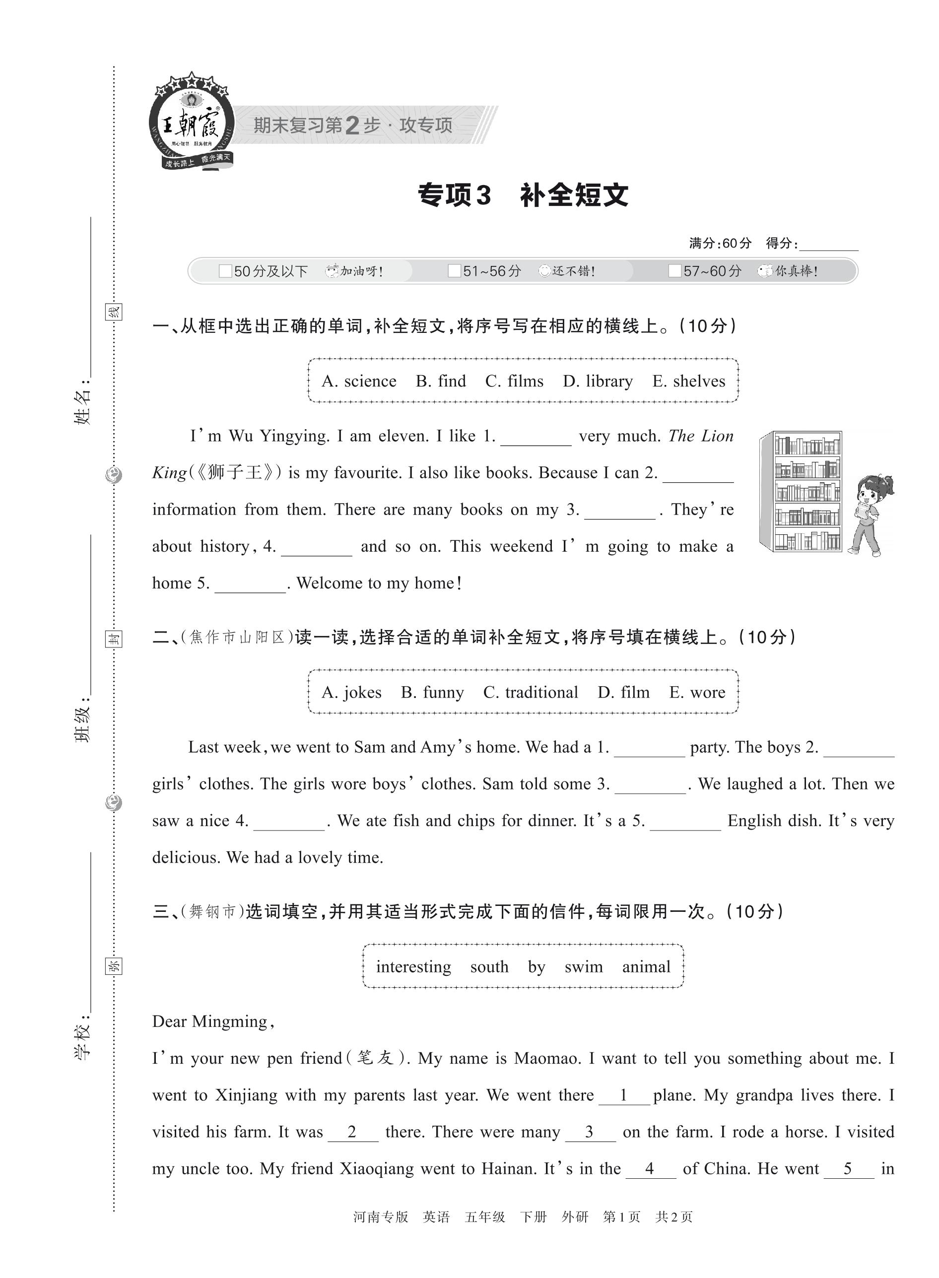 王朝霞期末专项卷——补全短文五年级下册英语(外研版)_R230428142553757【3】