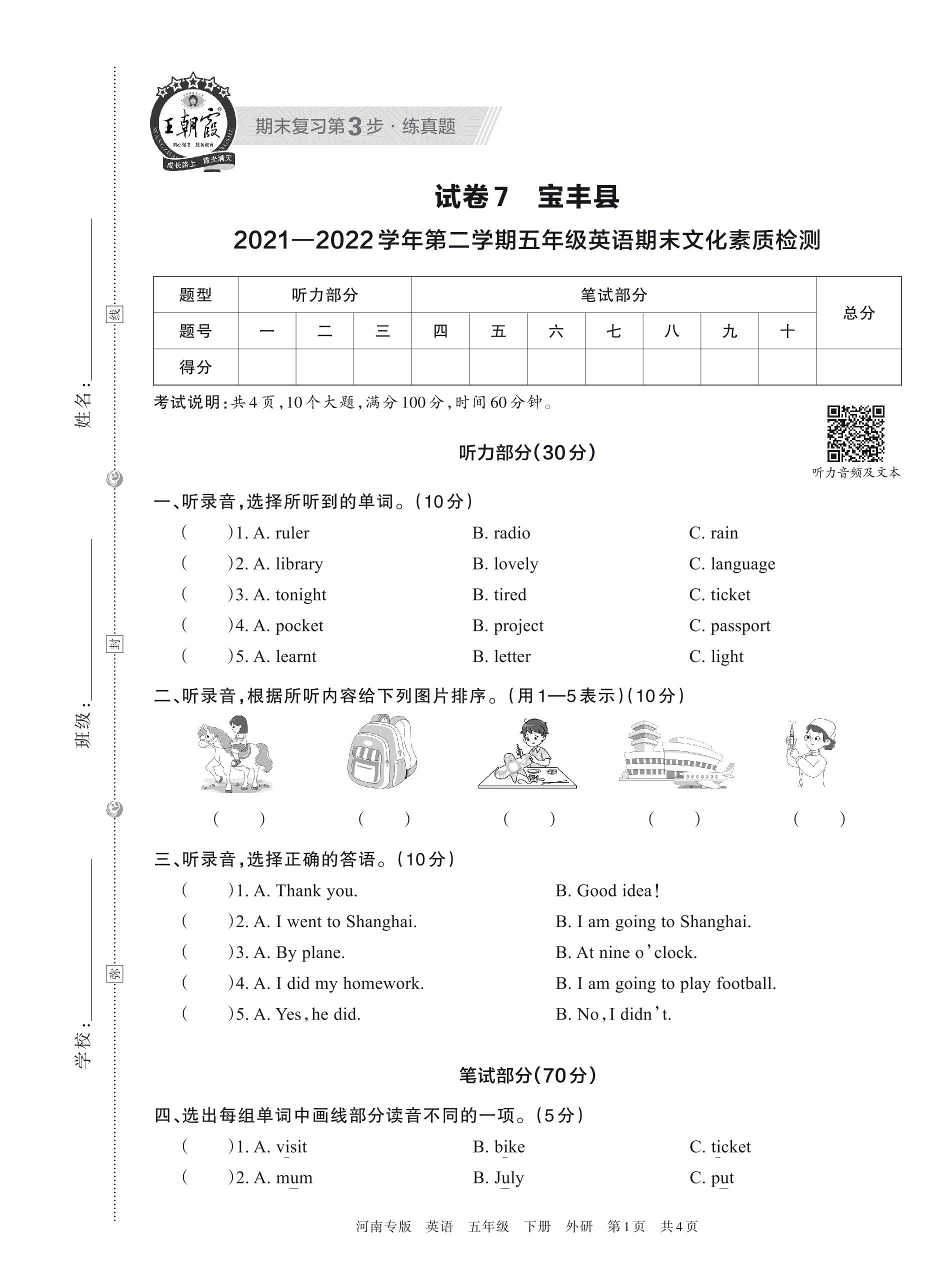 宝丰县2021—2022学年第二学期五年级英语期末文化素质检测(外研版)【7】