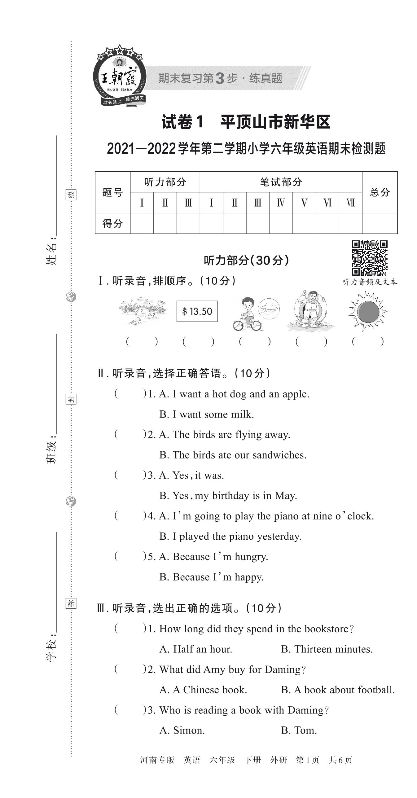 平顶山市新华区2021—2022学年第二学期小学六年级英语期末检测题(外研版)【1】