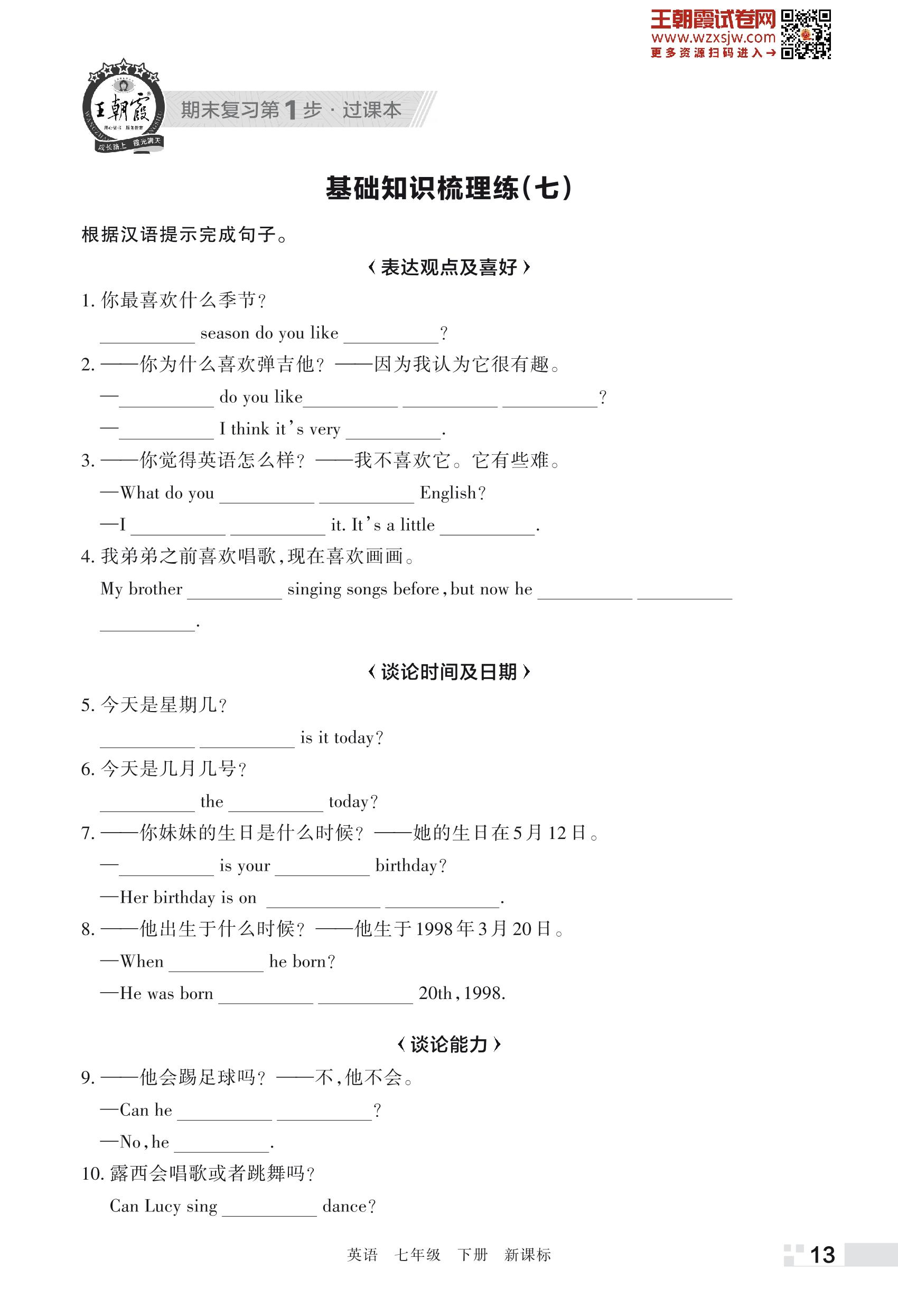 王朝霞期末过课本——基础知识梳理练(七)七年级下册英语(新课标版)_R230428144838672
