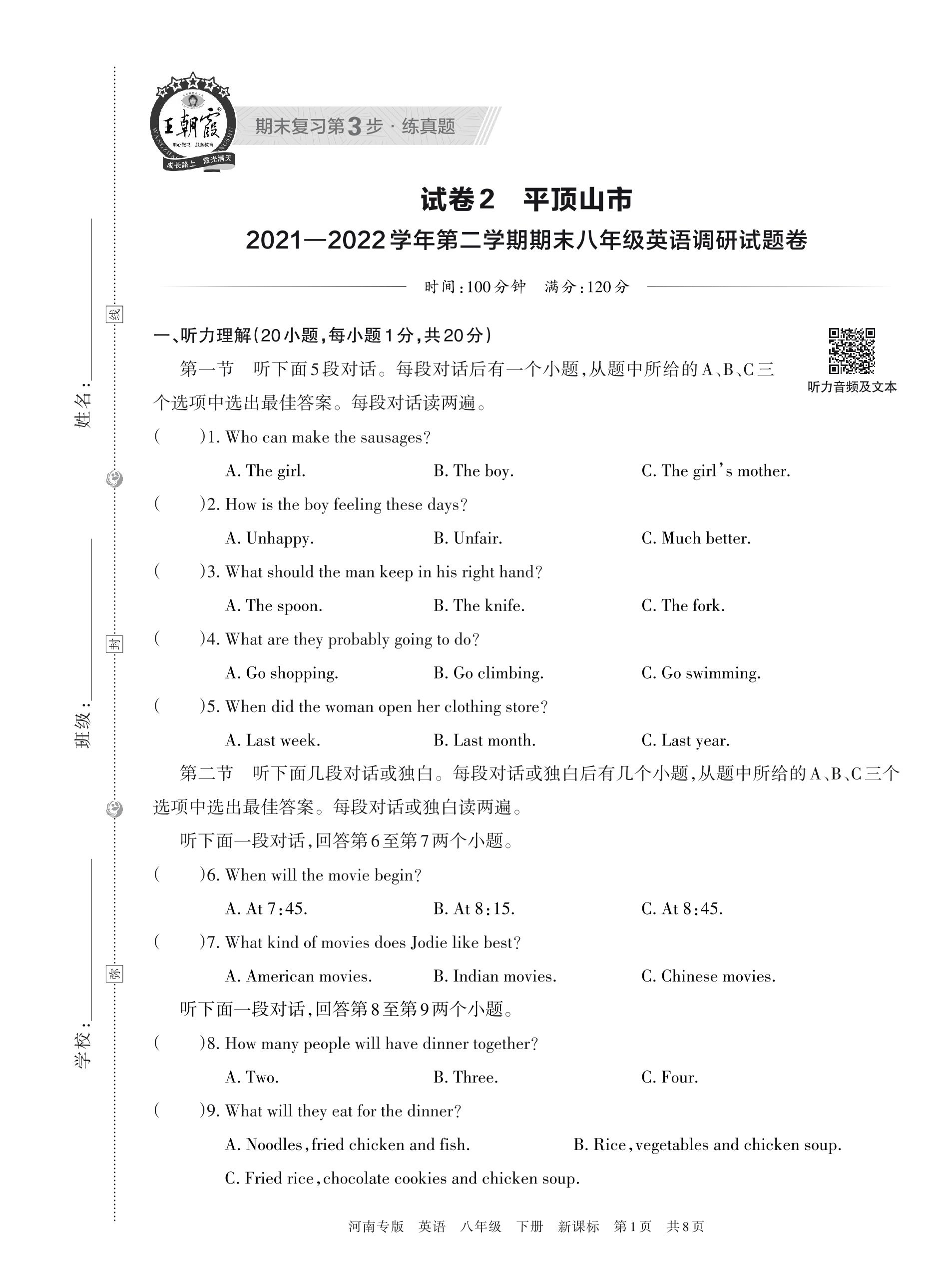 平顶山市2021—2022学年第二学期期末八年级英语调研试题卷(新课标版)【2】