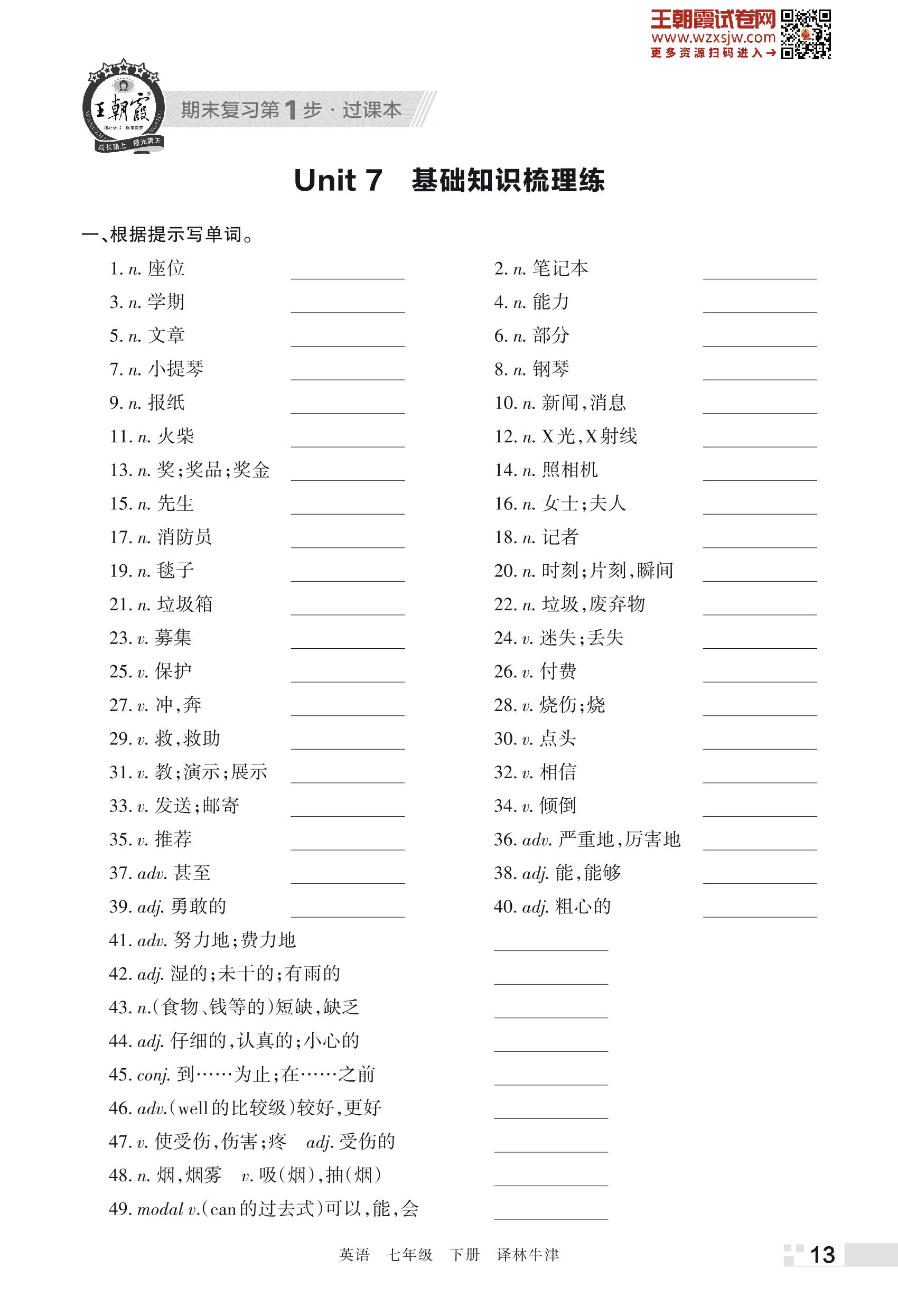王朝霞期末过课本——Unit 7 基础知识梳理练七年级下册英语(译林牛津版)_R230428150549710