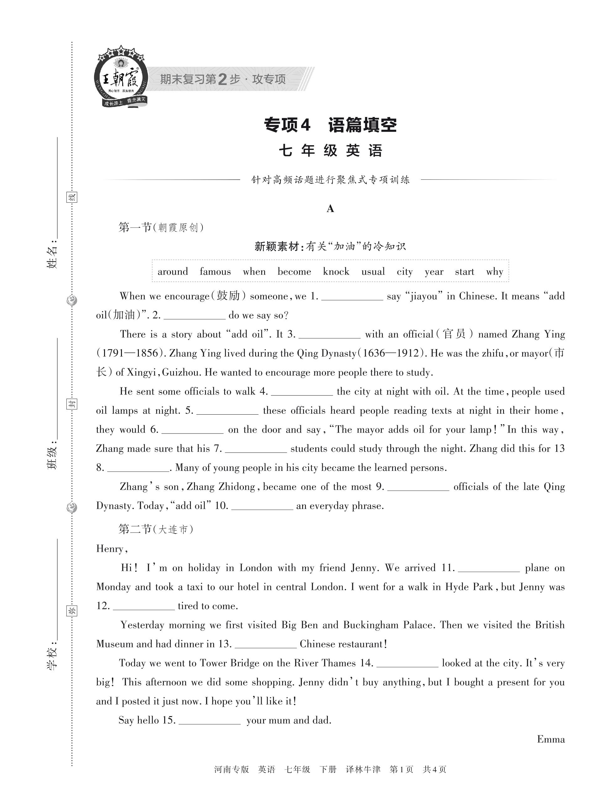 王朝霞期末专项卷——语篇填空七年级下册英语(译林牛津版)_R230428150549133【4】