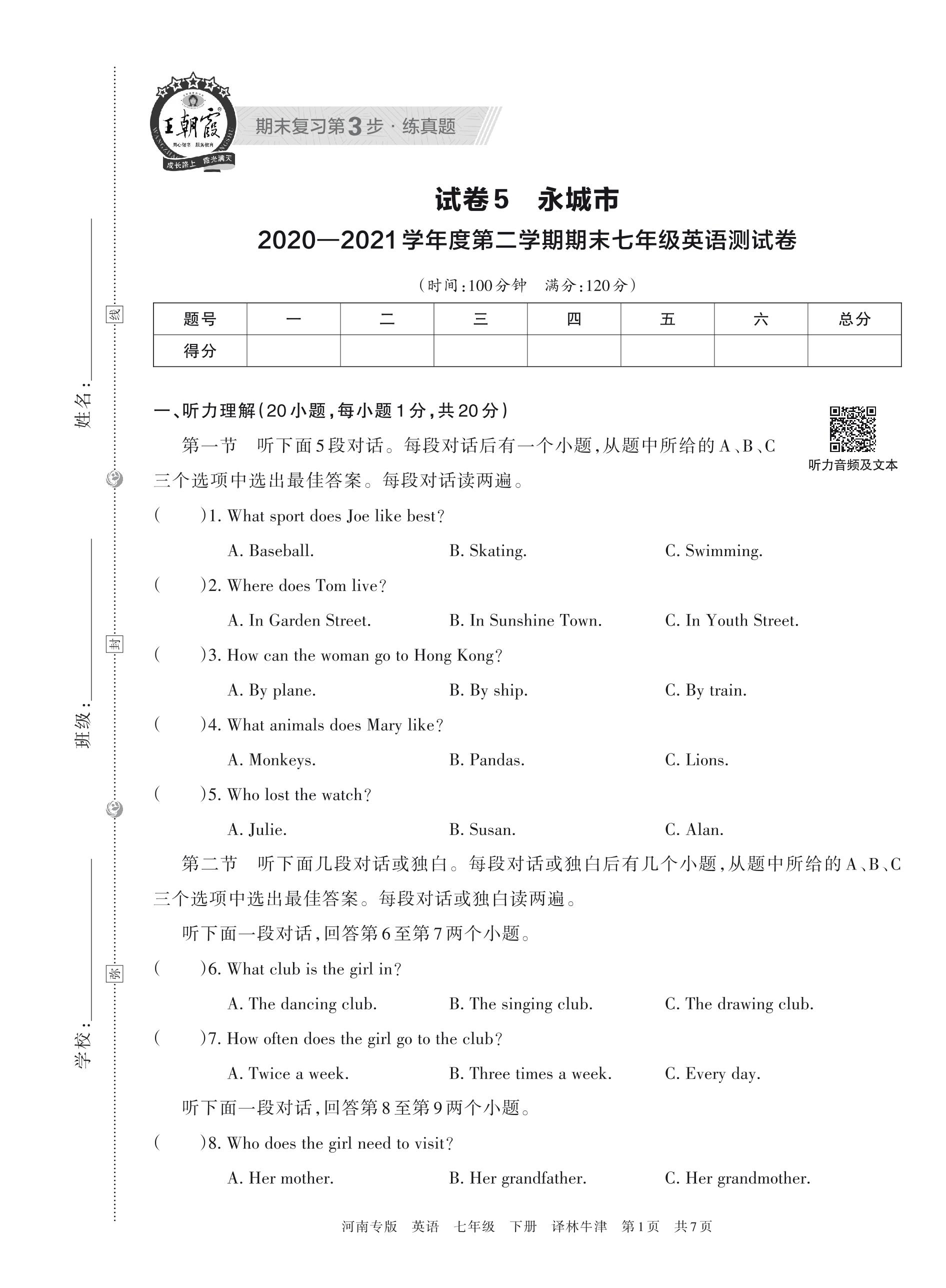 永城市2020—2021学年度第二学期期末七年级英语测试卷(译林牛津版)【5】