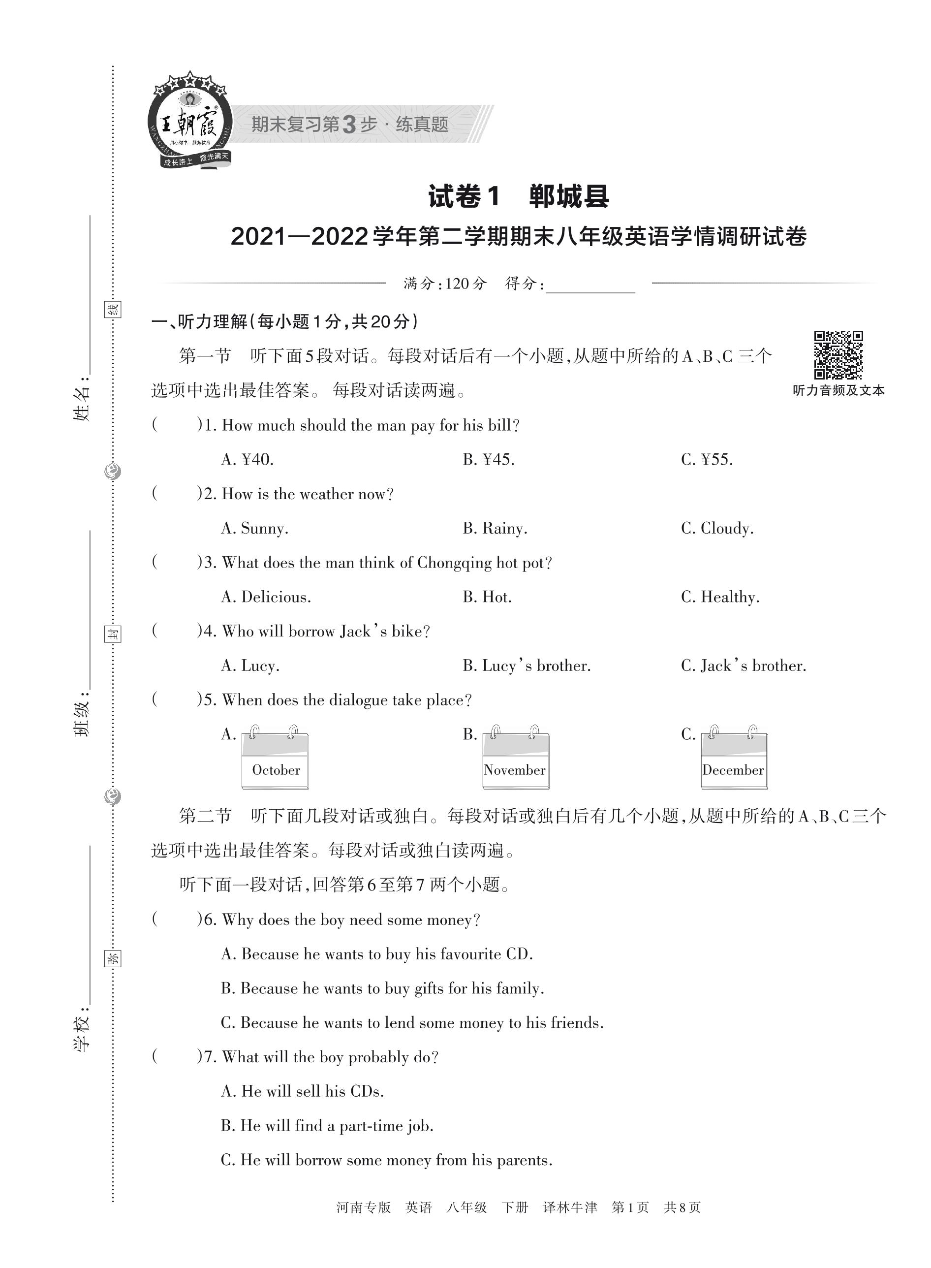 郸城县2021—2022学年第二学期期末八年级英语学情调研试卷(译林牛津版)【1】