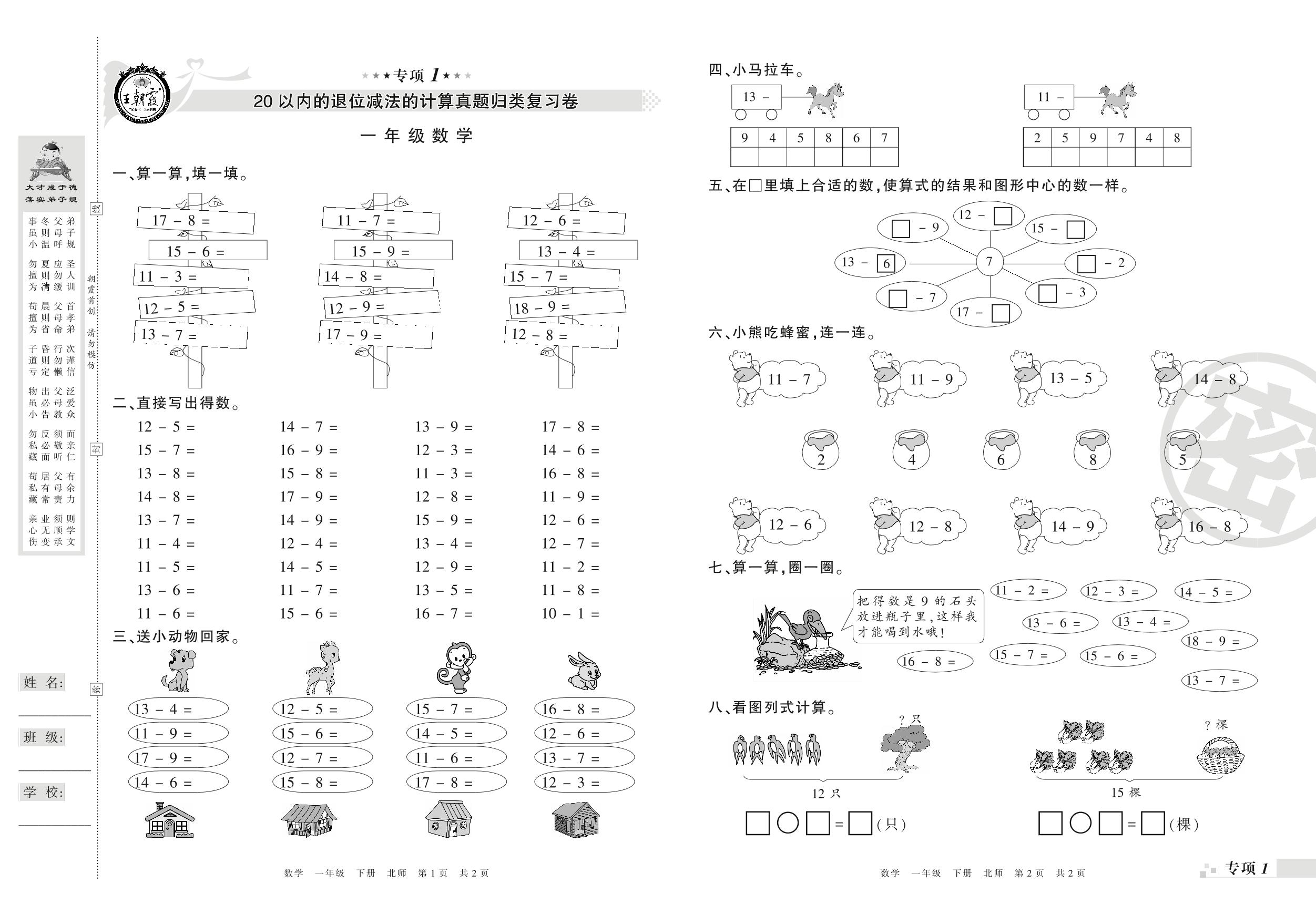 王朝霞期末专项卷——20以内的退位减法的计算、两位数加、减一位数的计算真题归类复习卷一年级下册数学(北师版)_R210802222047【0】