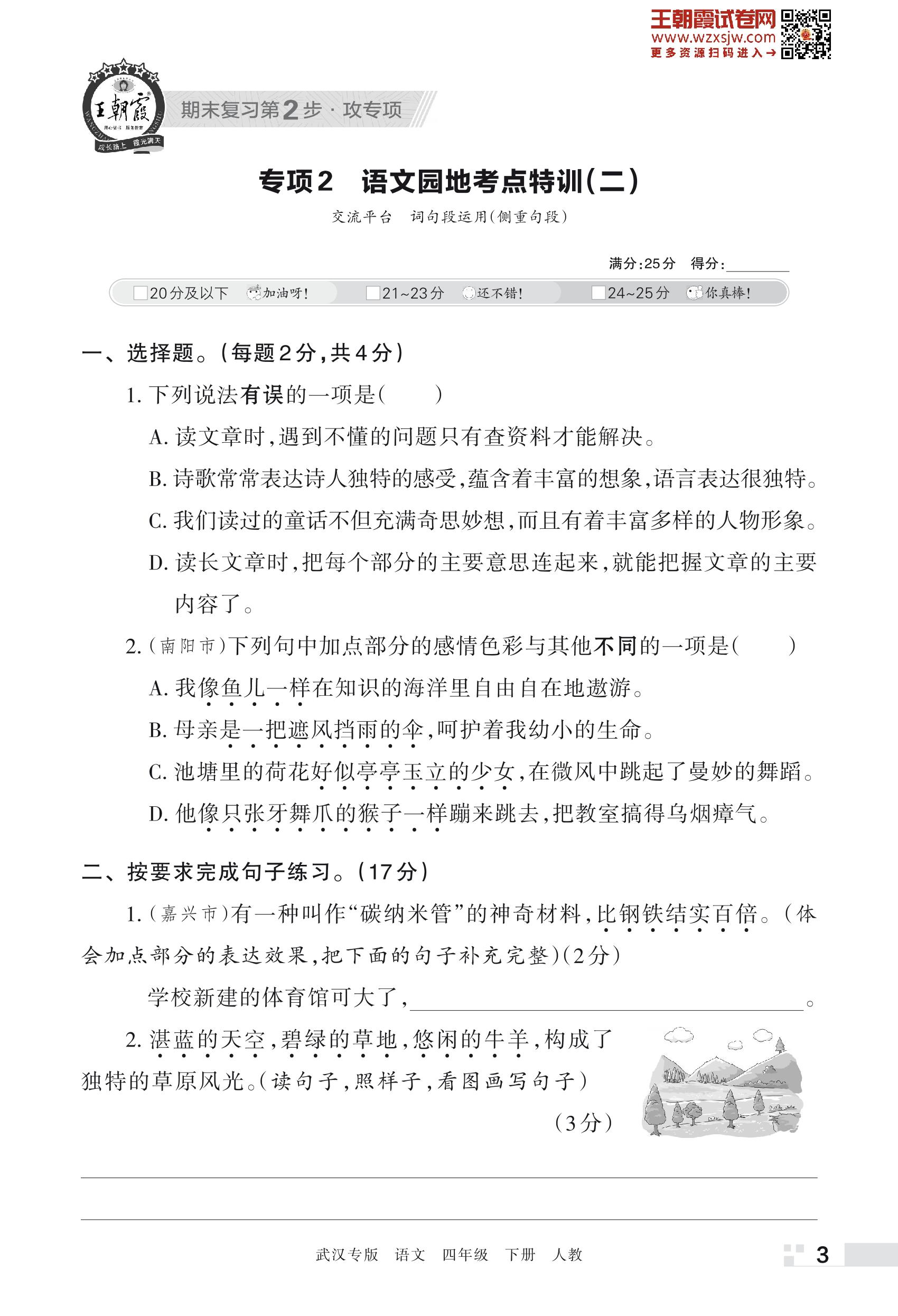 王朝霞期末专项卷——语文园地考点特训(二)四年级下册语文(人教版)_R230428151834251【2】