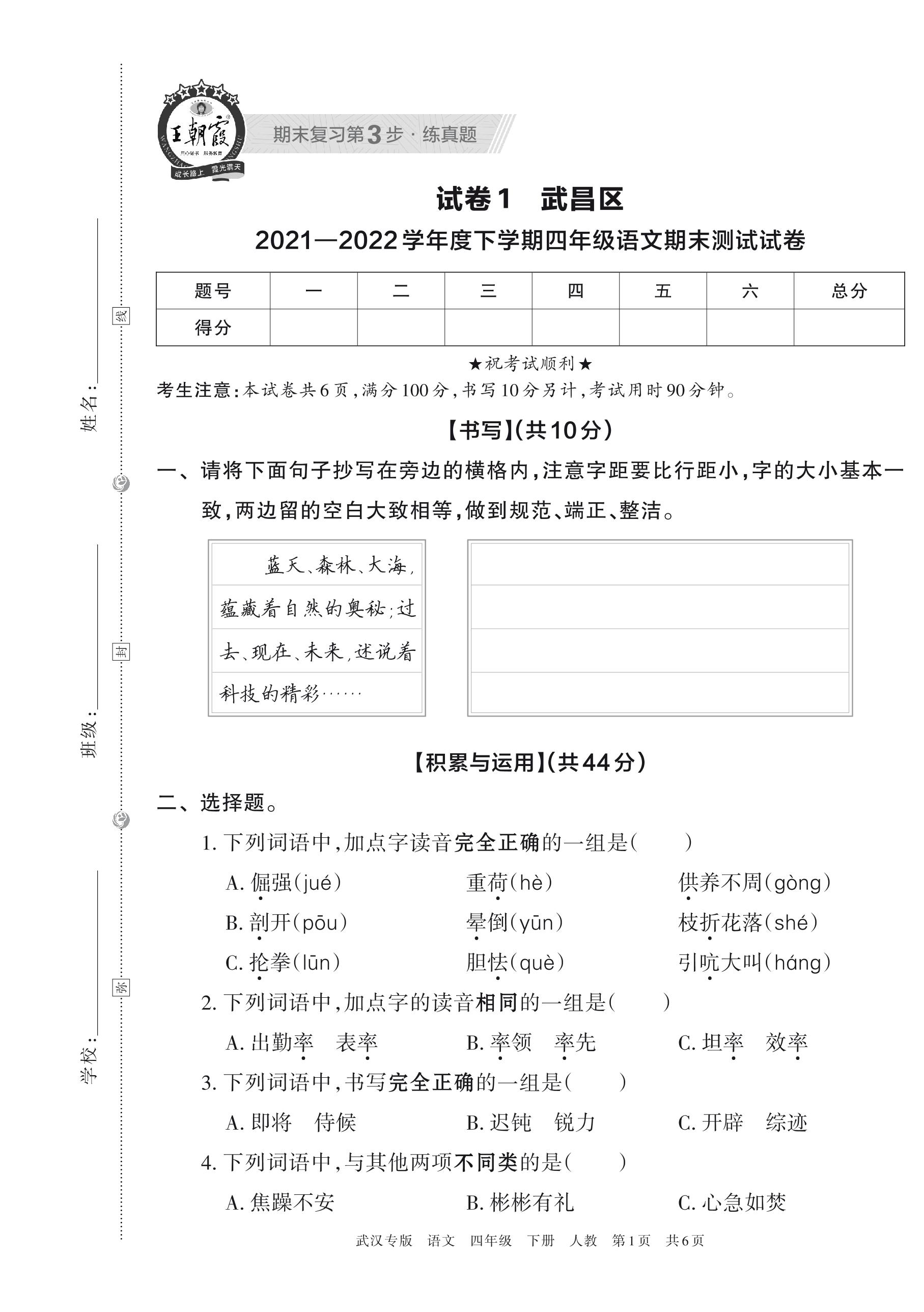 武昌区2021—2022学年度下学期四年级语文期末测试试卷(人教版)【1】