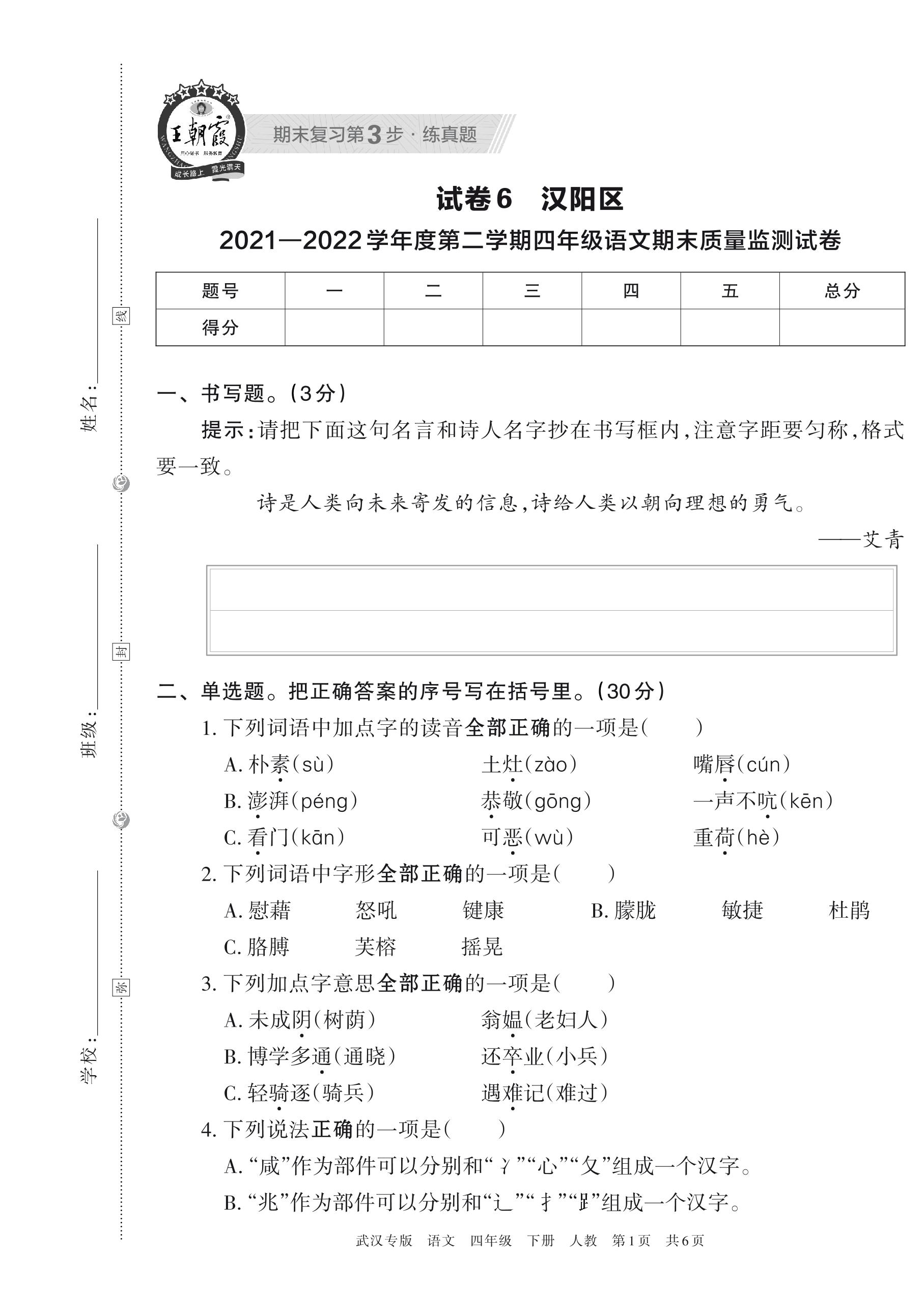 汉阳区2021—2022学年度第二学期四年级语文期末质量监测试卷(人教版)【6】