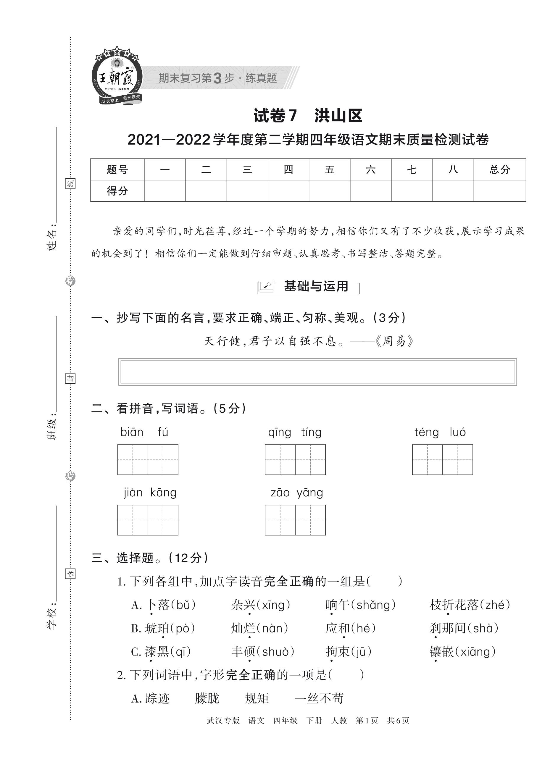 洪山区2021—2022学年度第二学期四年级语文期末质量检测试卷(人教版)【7】