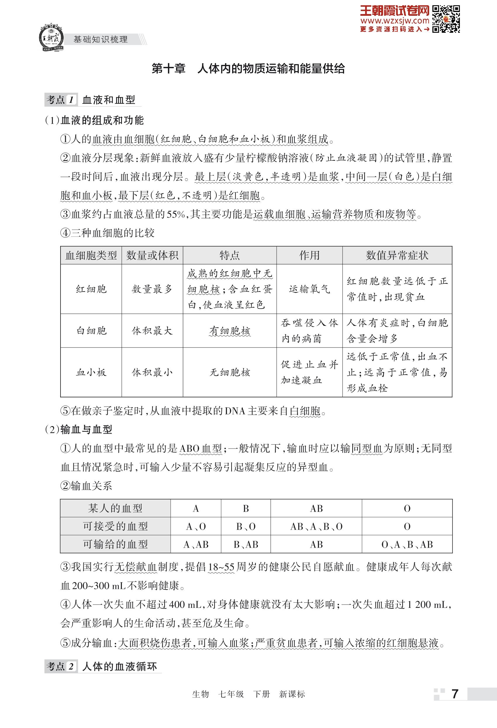 王朝霞期末知识梳理——第十章 人体内的物质运输和能量供给七年级下册生物(新课标版)