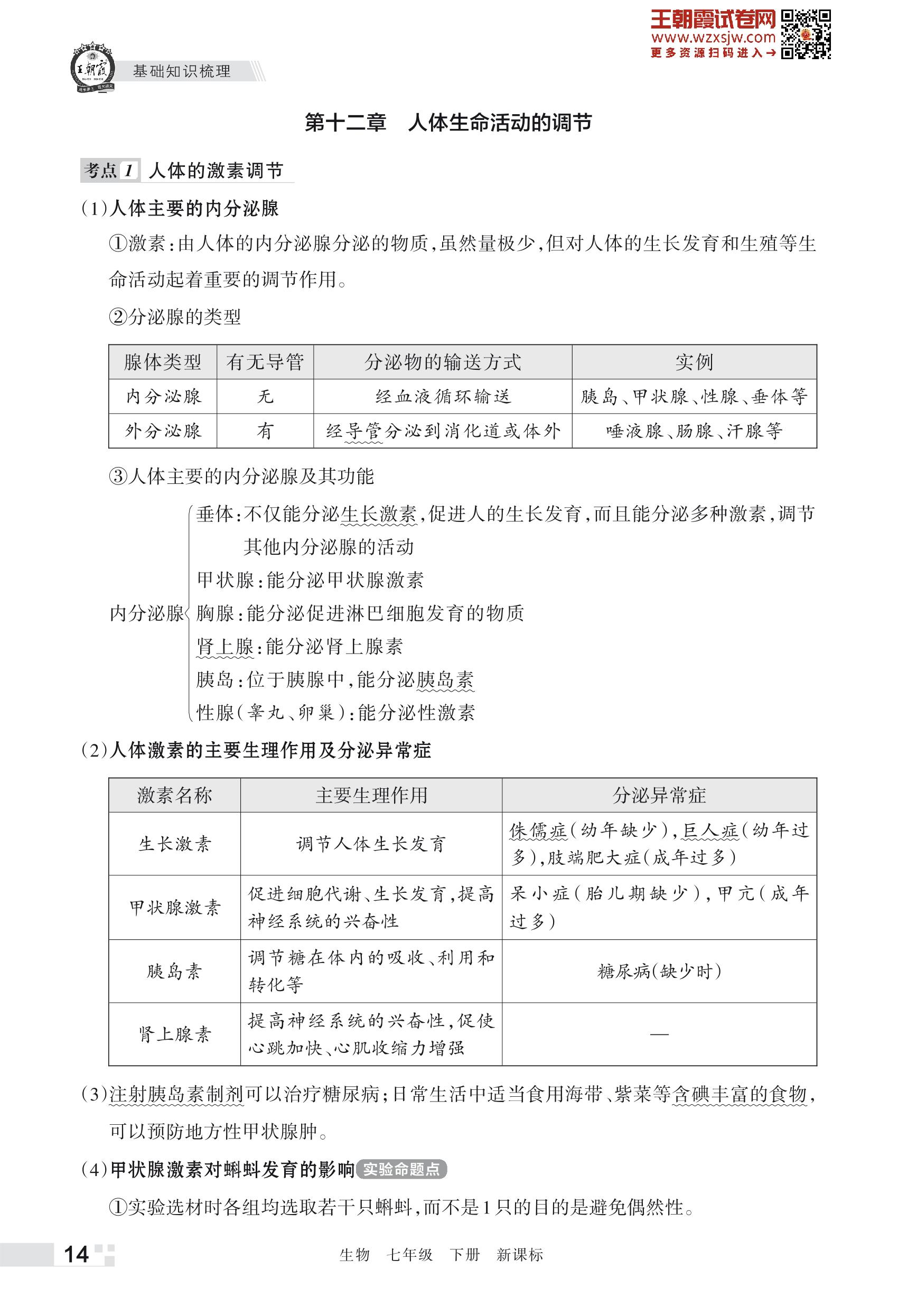 王朝霞期末知识梳理——第十二章 人体生命活动的调节七年级下册生物(新课标版)