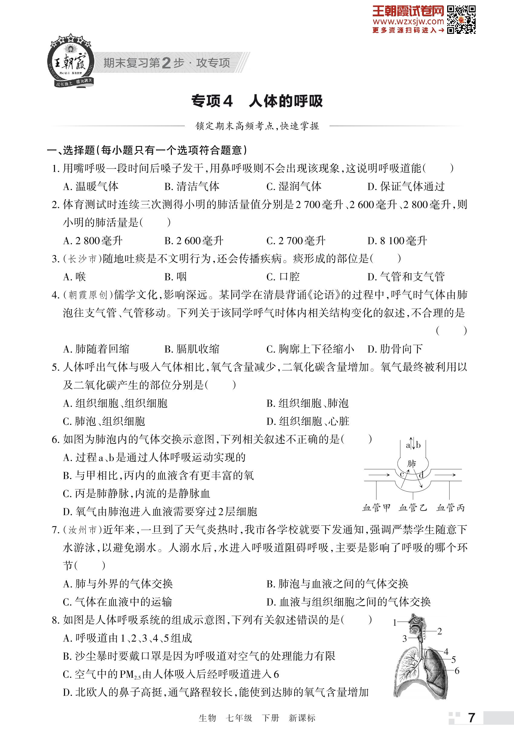 王朝霞期末专项卷——人体的呼吸七年级下册生物(新课标版)_R230428151955566【4】